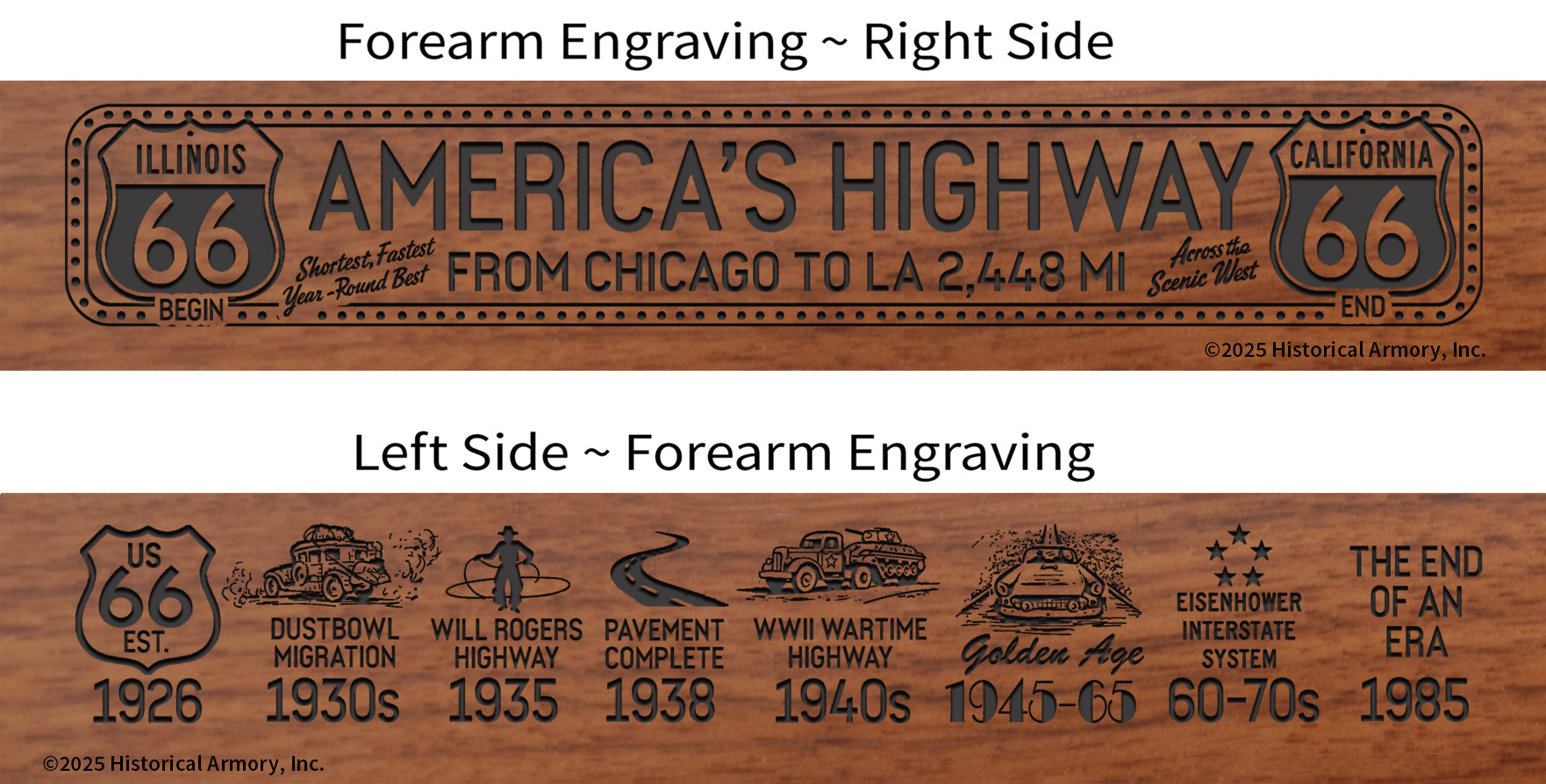 Celebrate the rich history of U.S. Route 66 with America's Highway Route 66 Limited Edition, featuring original artwork and highly-detailed laser engraving, proudly produced only by Historical Armory. For a limited time, a special 100th Anniversary engraving will be included on every rifle. This edition is limited to only 2,026 rifle sets. Artwork for this special limited edition highlights iconic destinations, pivotal moments, and inspiring symbols that have shaped Route 66 into one of the most famous highways in the world. This unique edition is engraved on the affordable, American-made Henry .22 LR Classic H001-22, .22 LR Golden Boy H004, Big Boy (.44 Mag H006G, .45 Colt H006GC, or .357/.38 H006GM), and the .30-30 Brass Side Gate H009BG models. Purchase each rifle separately, or all four (4) rifle options together for a complete limited edition set. Take advantage of this opportunity to commemorate America's Highway 100th birthday!