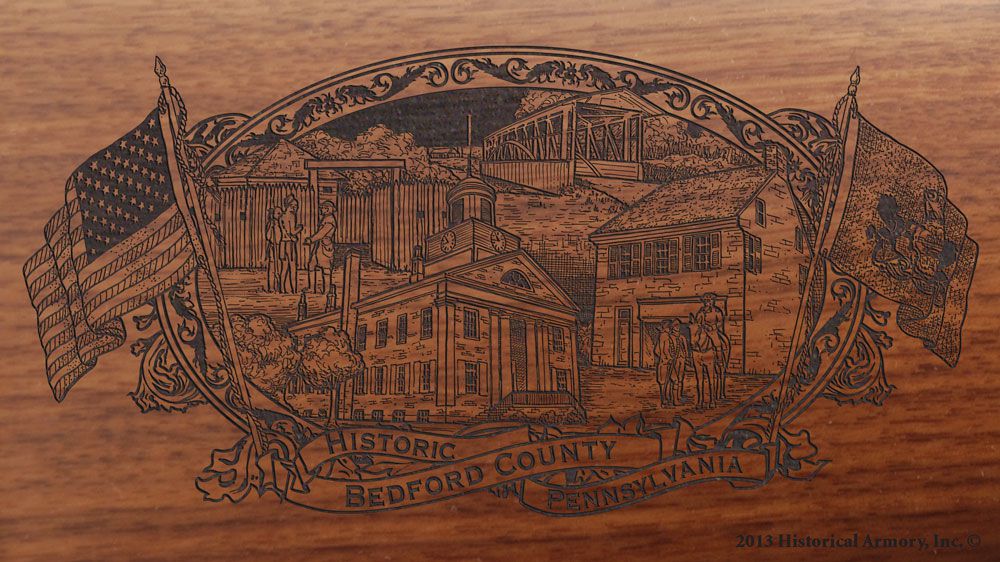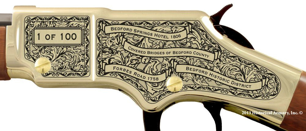 In honor of your county's rich historical legacy, Historical Armory is proud to present the Bedford County Pennsylvania Limited Historical Edition Rifle. Produced on the affordable, American-made Henry .22 LR rifle (Model H001 & H004) and .30-30 (Model H009BG, not pictured), the Bedford County Pennsylvania Limited Historical Edition rifle combines meticulous research, original artwork, and finely detailed engraving to celebrate the history of Bedford County. There will only be 100 Bedford County Pennsylvania rifle sets ever produced by Historical Armory. Purchase each model separately or all available rifle models together for a complete limited edition set.