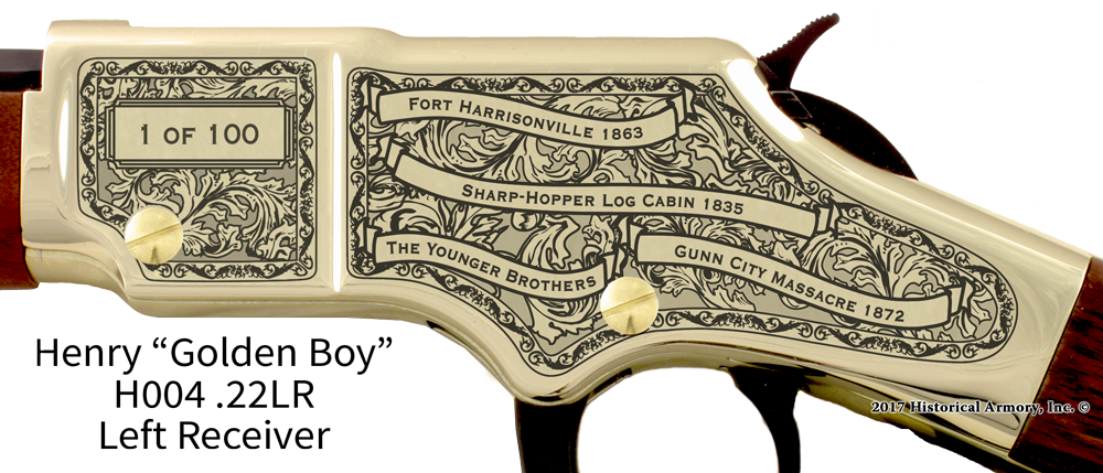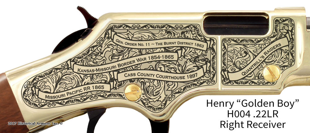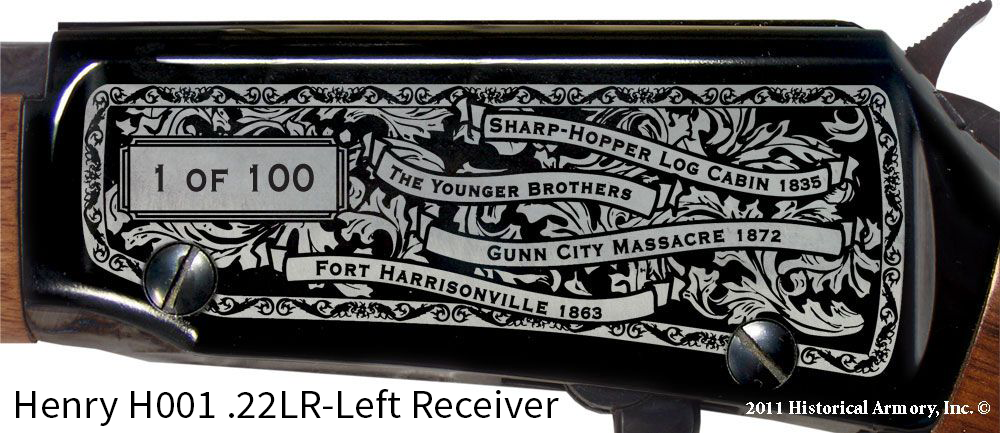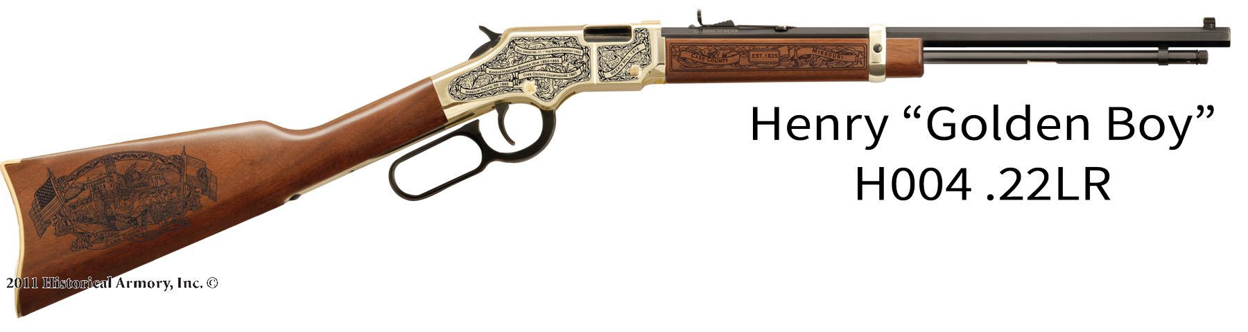 In honor of your county's rich historical legacy, Historical Armory is proud to present the Cass County Missouri Limited Historical Edition Rifle. Produced on the affordable, American-made Henry .22 LR rifle (Model H001 & H004) and .30-30 (Model H009BG), the Cass County Missouri Limited Historical Edition rifle combines meticulous research, original artwork, and finely detailed engraving to celebrate the history of Cass County. There will only be 100 Cass County Missouri rifle sets ever produced by Historical Armory. Purchase each model separately or all available rifle models together for a complete limited edition set.