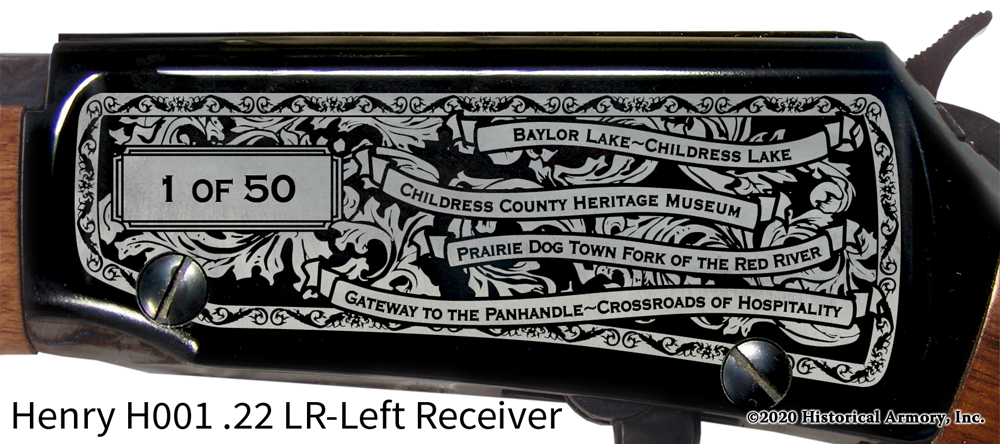 In honor of your county's rich historical legacy, Historical Armory is proud to present the Childress County Texas Limited Historical Edition Rifle. Produced on the affordable, American-made Henry .22 LR rifle (Model H001 & H004) and .30-30 (Model H009BG), the Childress County Texas Limited Historical Edition rifle combines meticulous research, original artwork, and finely detailed engraving to celebrate the history of Childress County. There will only be 50 Childress County Texas rifle sets ever produced by Historical Armory. Purchase each model separately or all available rifle models together for a complete limited edition set.