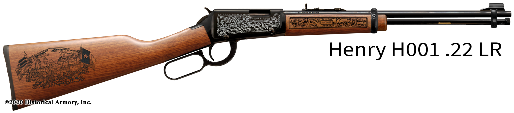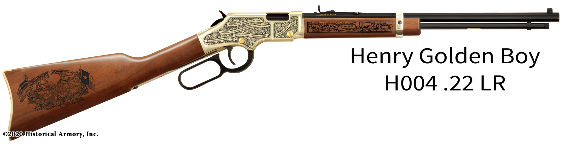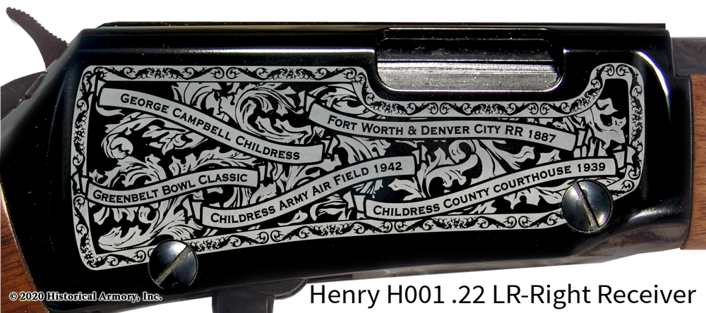 Renowned for their durability and solid construction, Henry rifles offer you a welcome shelter from the planned mechanical obsolescence so common in modern products these days. Well-maintained, they will continue to perform as designed for generations to come, perhaps even one day becoming a treasured family heirloom for your descendants. Start your own tradition of lasting permanence today with the Childress County Texas Engraved Rifle, available only from Historical Armory!