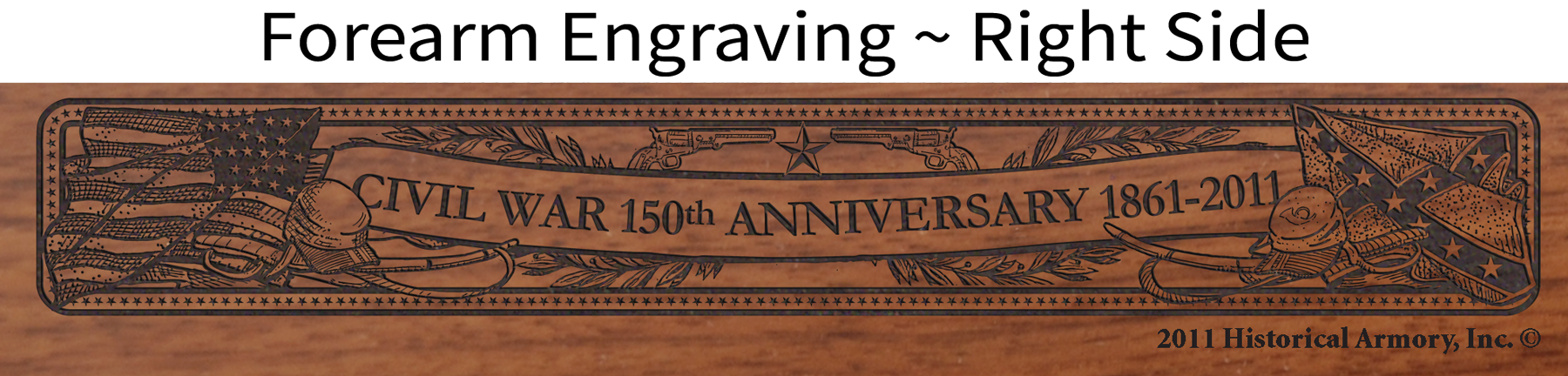 Detailed engraving on both sides of the American walnut forearm, with the Civil War 150th Anniversary dates on the right side and a Union, Confederate, or Border state-specific banner on the left side.