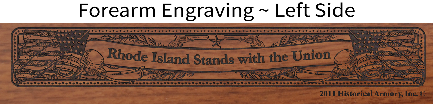 Detailed engraving on both sides of the American walnut forearm, with the Civil War 150th Anniversary dates on the right side and a Union, Confederate, or Border state-specific banner on the left side.