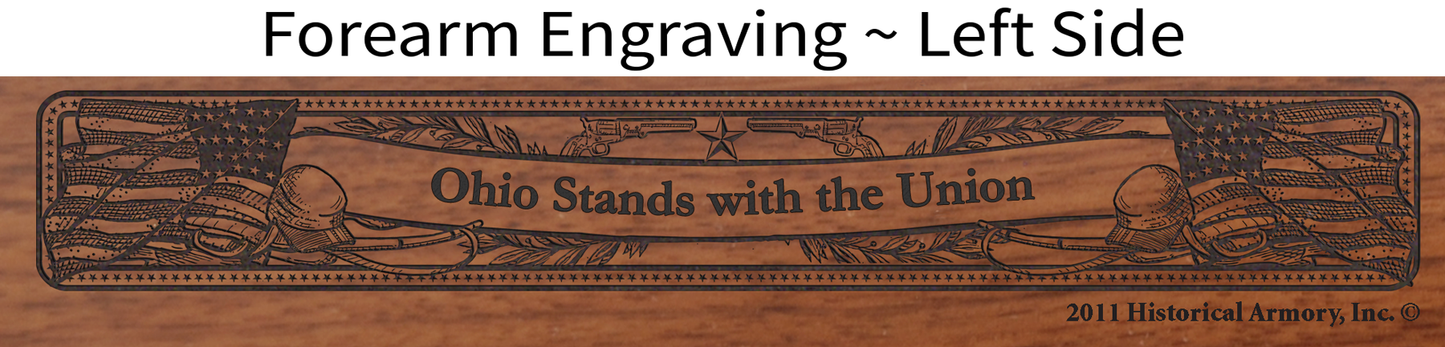 Detailed engraving on both sides of the American walnut forearm, with the Civil War 150th Anniversary dates on the right side and a Union, Confederate, or Border state-specific banner on the left side.