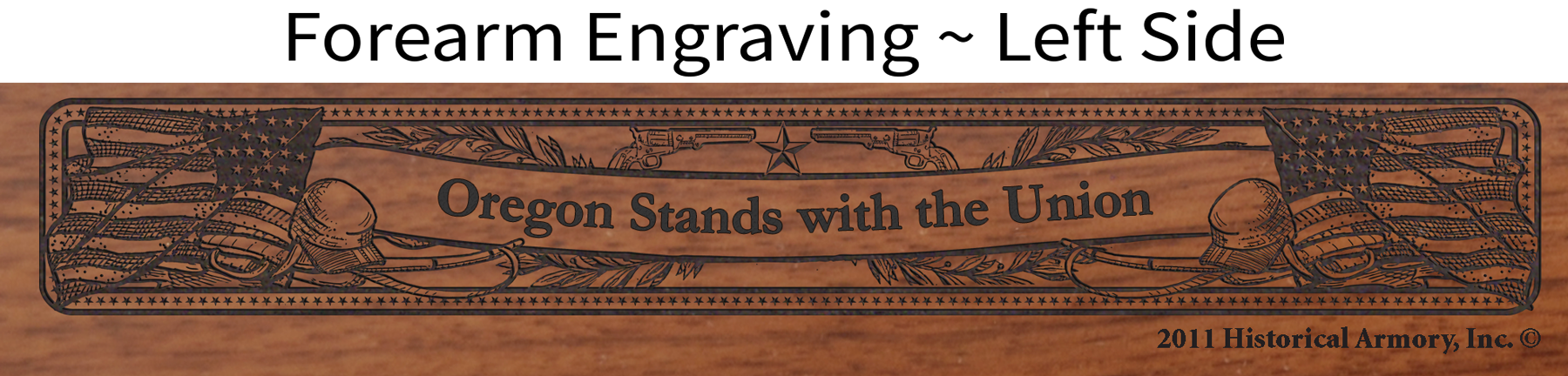 Detailed engraving on both sides of the American walnut forearm, with the Civil War 150th Anniversary dates on the right side and a Union, Confederate, or Border state-specific banner on the left side.