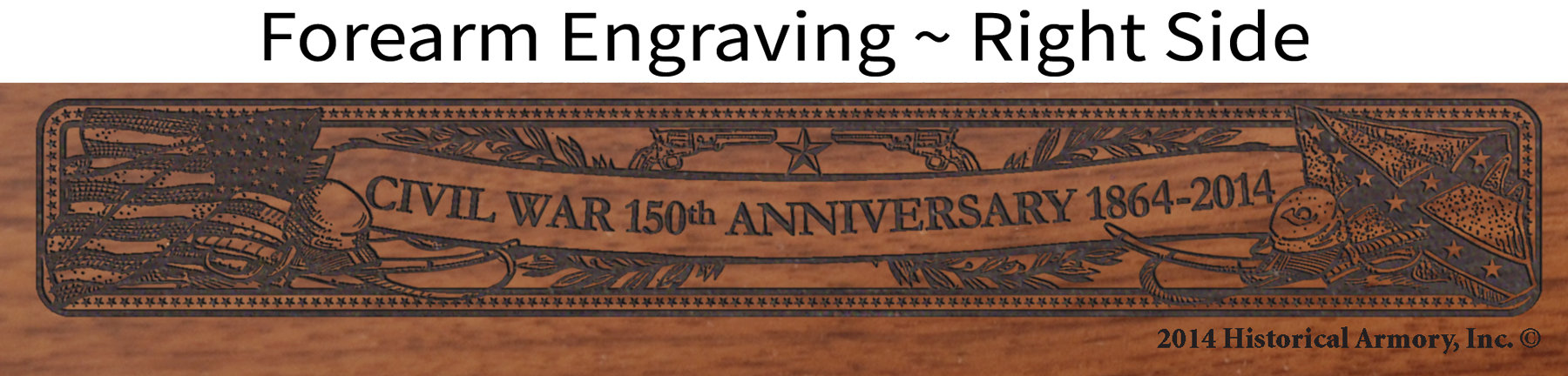 Detailed engraving on both sides of the American walnut forearm, with the Civil War 150th Anniversary dates on the right side and a Union or Confederate state-specific banner on the left side.