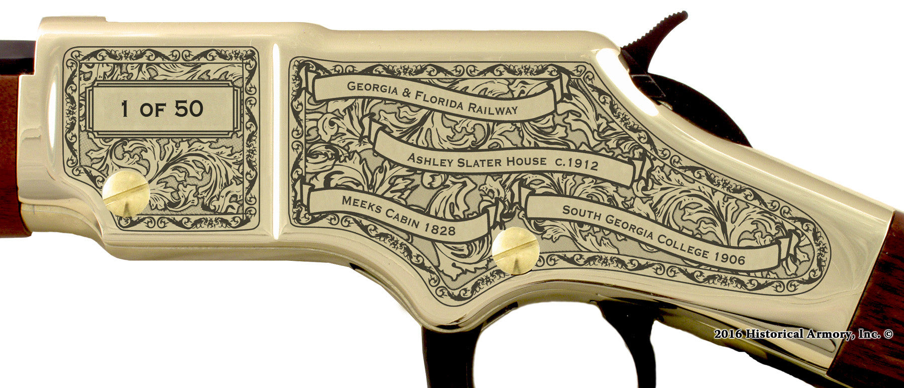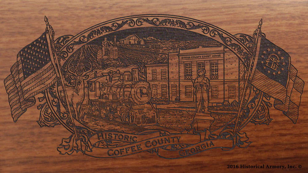 In honor of your county's rich historical legacy, Historical Armory is proud to present the Coffee County Georgia Limited Historical Edition Rifle. Produced on the affordable, American-made Henry .22 LR rifle (Model H001 & H004) and .30-30 (Model H009BG), the Coffee County Georgia Limited Historical Edition rifle combines meticulous research, original artwork, and finely detailed engraving to celebrate the history of Coffee County. There will only be 50 Coffee County Georgia rifle sets ever produced by Historical Armory. Purchase each model separately or all available rifle models together for a complete limited edition set.