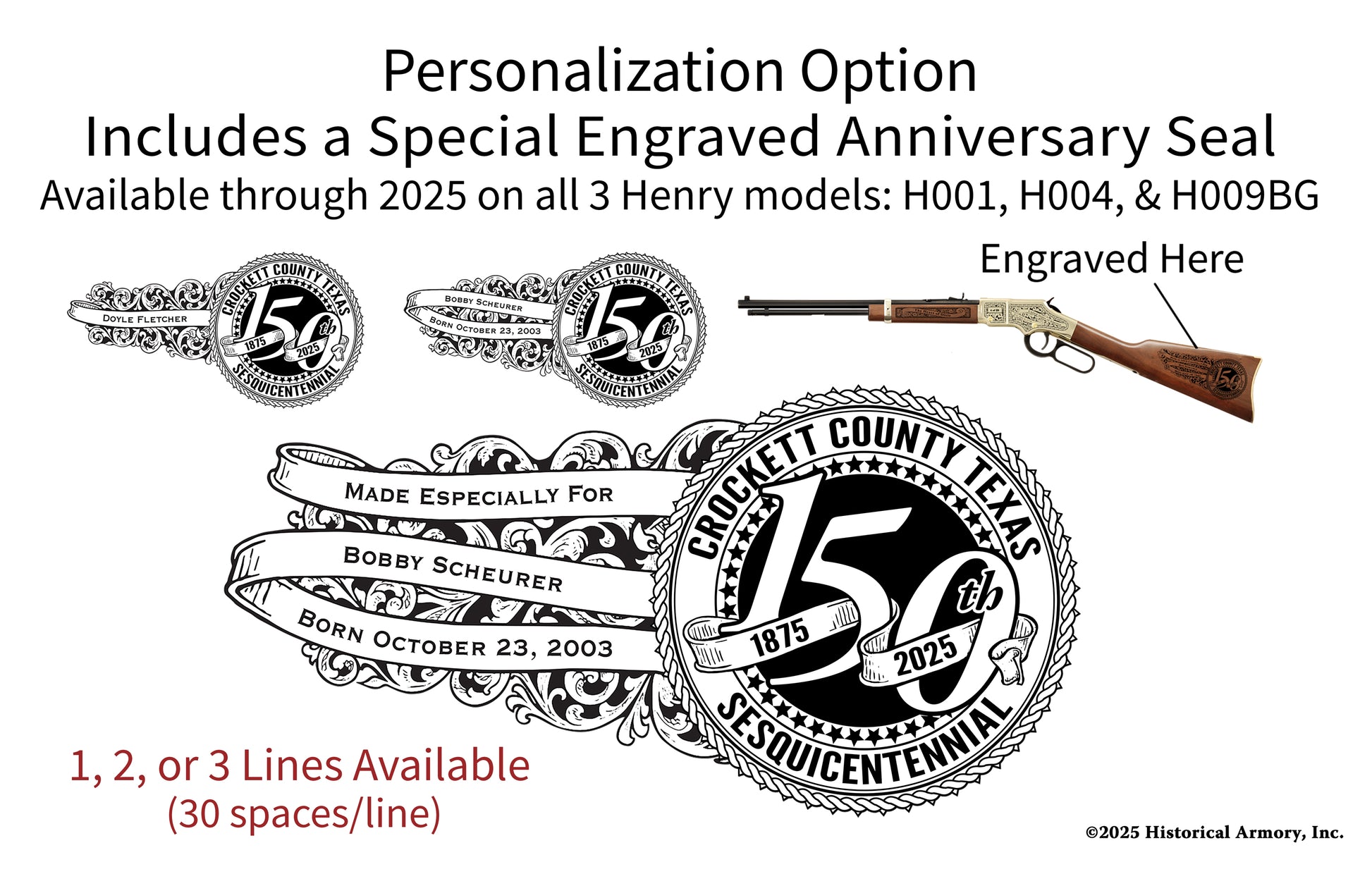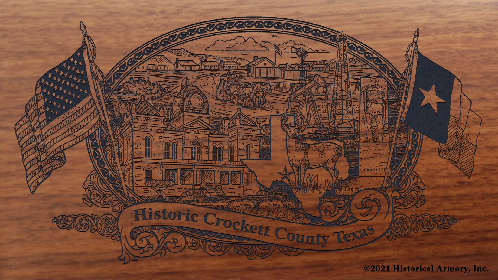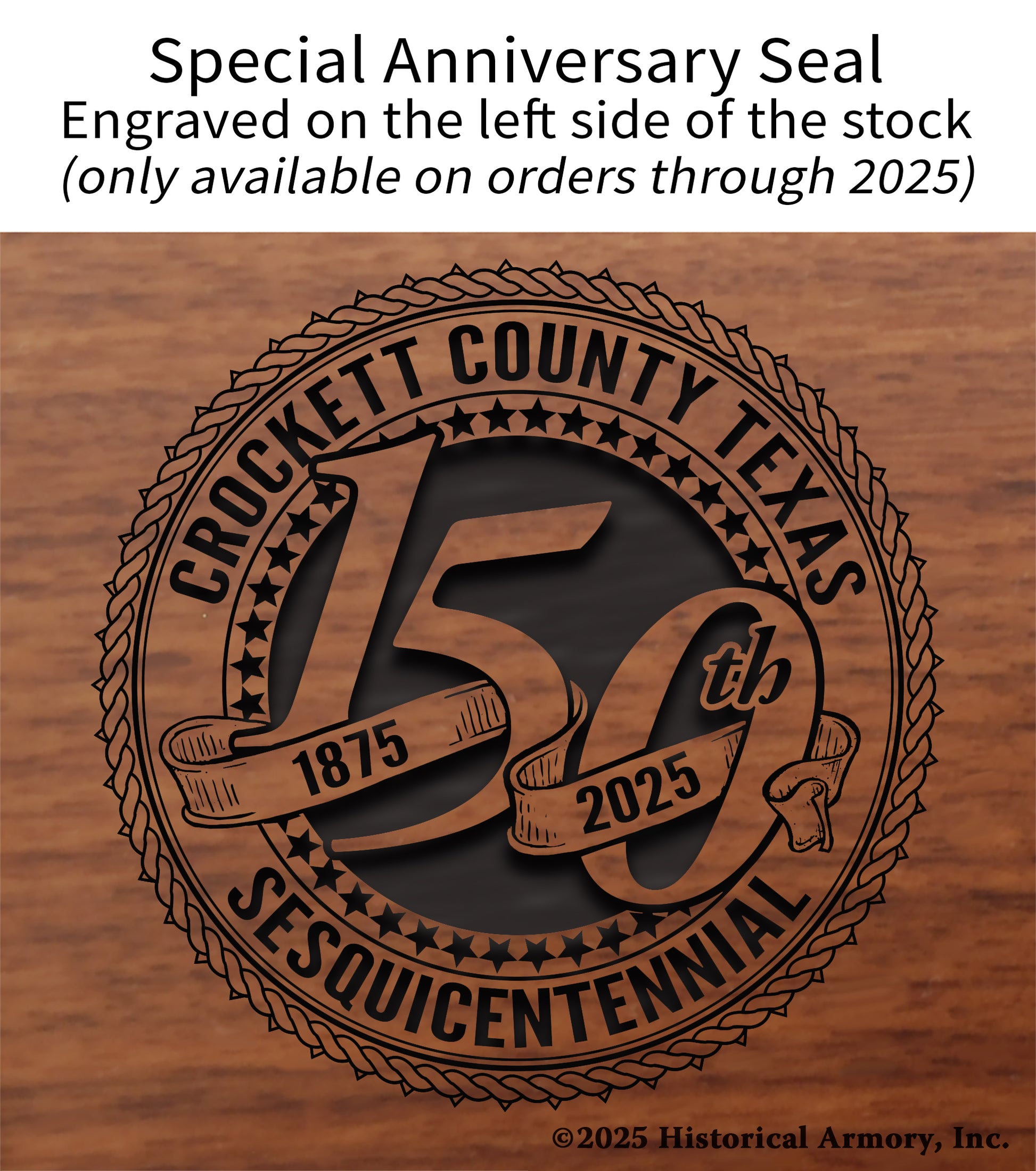 In honor of your county's rich historical legacy, Historical Armory is proud to present the Crockett County Texas Limited Historical Edition Rifle. Produced on the affordable, American-made Henry .22 LR rifle (Model H001 & H004) and .30-30 (Model H009BG), the Crockett County Texas Limited Historical Edition rifle combines meticulous research, original artwork, and finely detailed engraving to celebrate the history of Crockett County. There will only be 50 Crockett County Texas rifle sets ever produced by Historical Armory. Purchase each model separately or all available rifle models together for a complete limited edition set.
