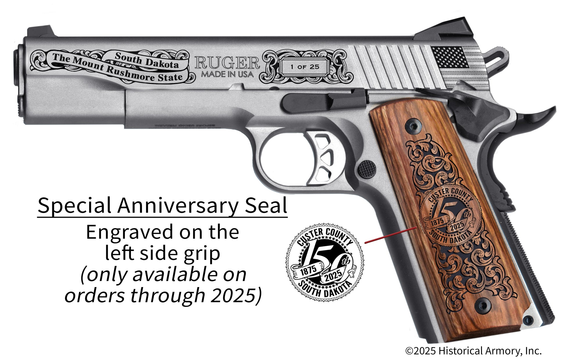 In honor of your county's rich historical legacy, Historical Armory is proud to present the Custer County South Dakota 1911 Limited Edition. This special edition combines meticulous research, original artwork, and finely detailed engraving to celebrate the history of Custer County South Dakota. There will only be 25 Custer County South Dakota pistols ever produced by Historical Armory!
