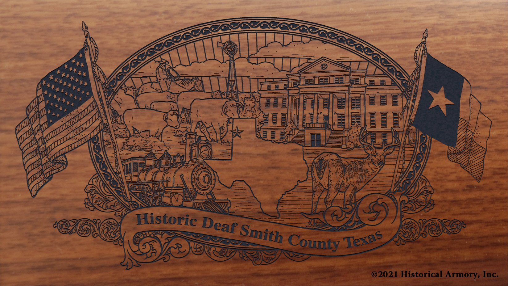 - The right side of the American walnut buttstock is engraved with an intricate, original piece of artwork that captures the unique history of your county, while the left side is reserved for one of a kind personalization.