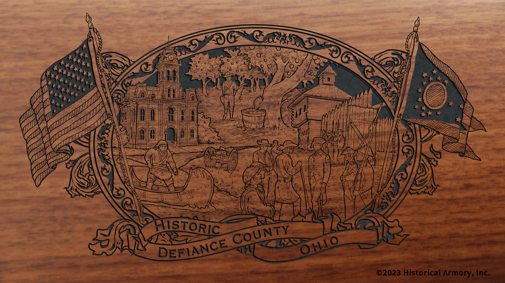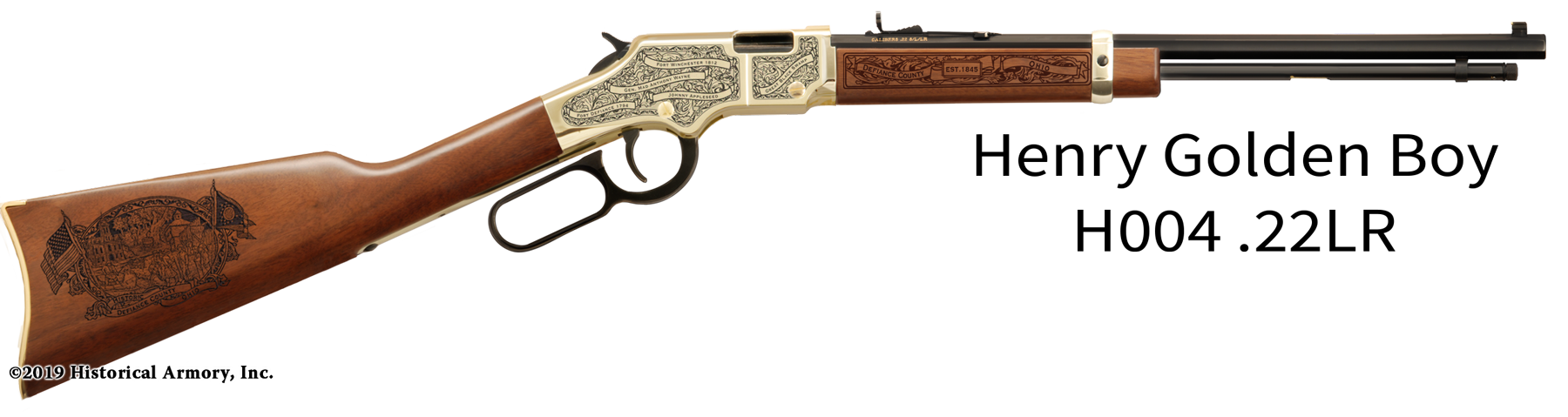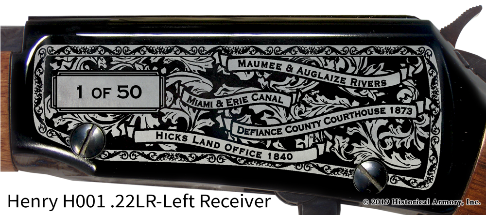 In honor of your county's rich historical legacy, Historical Armory is proud to present the Defiance County Ohio Limited Historical Edition Rifle. Produced on the affordable, American-made Henry .22 LR rifle (Model H001 & H004) and .30-30 (Model H009BG), the Defiance County Ohio Limited Historical Edition rifle combines meticulous research, original artwork, and finely detailed engraving to celebrate the history of Defiance County. There will only be 50 Defiance County Ohio rifle sets ever produced by Historical Armory. Purchase each model separately or all available rifle models together for a complete limited edition set.