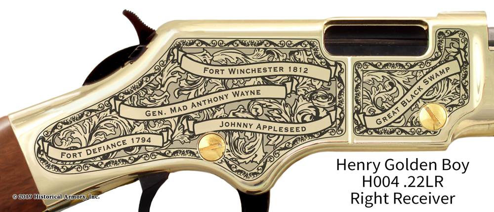 Renowned for their durability and solid construction, Henry rifles offer you a welcome shelter from the planned mechanical obsolescence so common in modern products these days. Well-maintained, they will continue to perform as designed for generations to come, perhaps even one day becoming a treasured family heirloom for your descendants. Start your own tradition of lasting permanence today with the Defiance County Ohio Engraved Rifle, available only from Historical Armory!