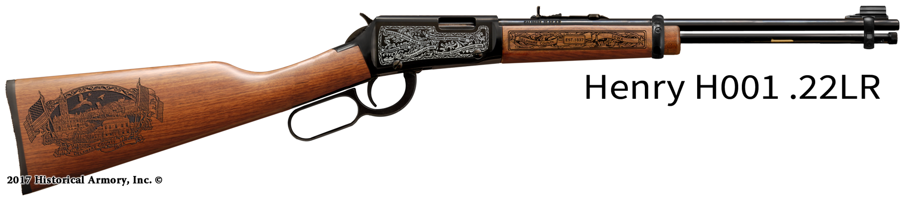 In honor of your county's rich historical legacy, Historical Armory is proud to present the Delaware County Iowa Limited Historical Edition Rifle. Produced on the affordable, American-made Henry .22 LR rifle (Model H001 & H004) and .30-30 (Model H009BG), the Delaware County Iowa Limited Historical Edition rifle combines meticulous research, original artwork, and finely detailed engraving to celebrate the history of Delaware County. There will only be 28 Delaware County Iowa rifle sets ever produced by Historical Armory. Purchase each model separately or all available rifle models together for a complete limited edition set.