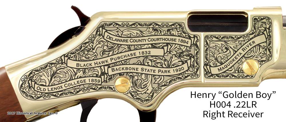 Renowned for their durability and solid construction, Henry rifles offer you a welcome shelter from the planned mechanical obsolescence so common in modern products these days. Well-maintained, they will continue to perform as designed for generations to come, perhaps even one day becoming a treasured family heirloom for your descendants. Start your own tradition of lasting permanence today with the Delaware County Iowa Engraved Rifle, available only from Historical Armory!