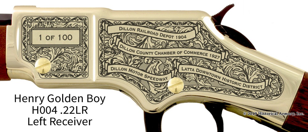 In honor of your county's rich historical legacy, Historical Armory is proud to present the Dillon County South Carolina Limited Historical Edition Rifle. Produced on the affordable, American-made Henry .22 LR rifle (Model H001 & H004) and .30-30 (Model H009BG), the Dillon County South Carolina Limited Historical Edition rifle combines meticulous research, original artwork, and finely detailed engraving to celebrate the history of Dillon County. There will only be 100 Dillon County South Carolina rifle sets ever produced by Historical Armory. Purchase each model separately or all available rifle models together for a complete limited edition set.