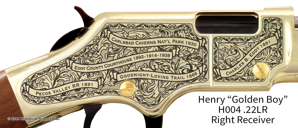 In honor of your county's rich historical legacy, Historical Armory is proud to present the Eddy County New Mexico Limited Historical Edition Rifle. Produced on the affordable, American-made Henry .22 LR rifle (Model H001 & H004) and .30-30 (Model H009BG), the Eddy County New Mexico Limited Historical Edition rifle combines meticulous research, original artwork, and finely detailed engraving to celebrate the history of Eddy County. There will only be 100 Eddy County New Mexico rifle sets ever produced by Historical Armory. Purchase each model separately or all available rifle models together for a complete limited edition set.
