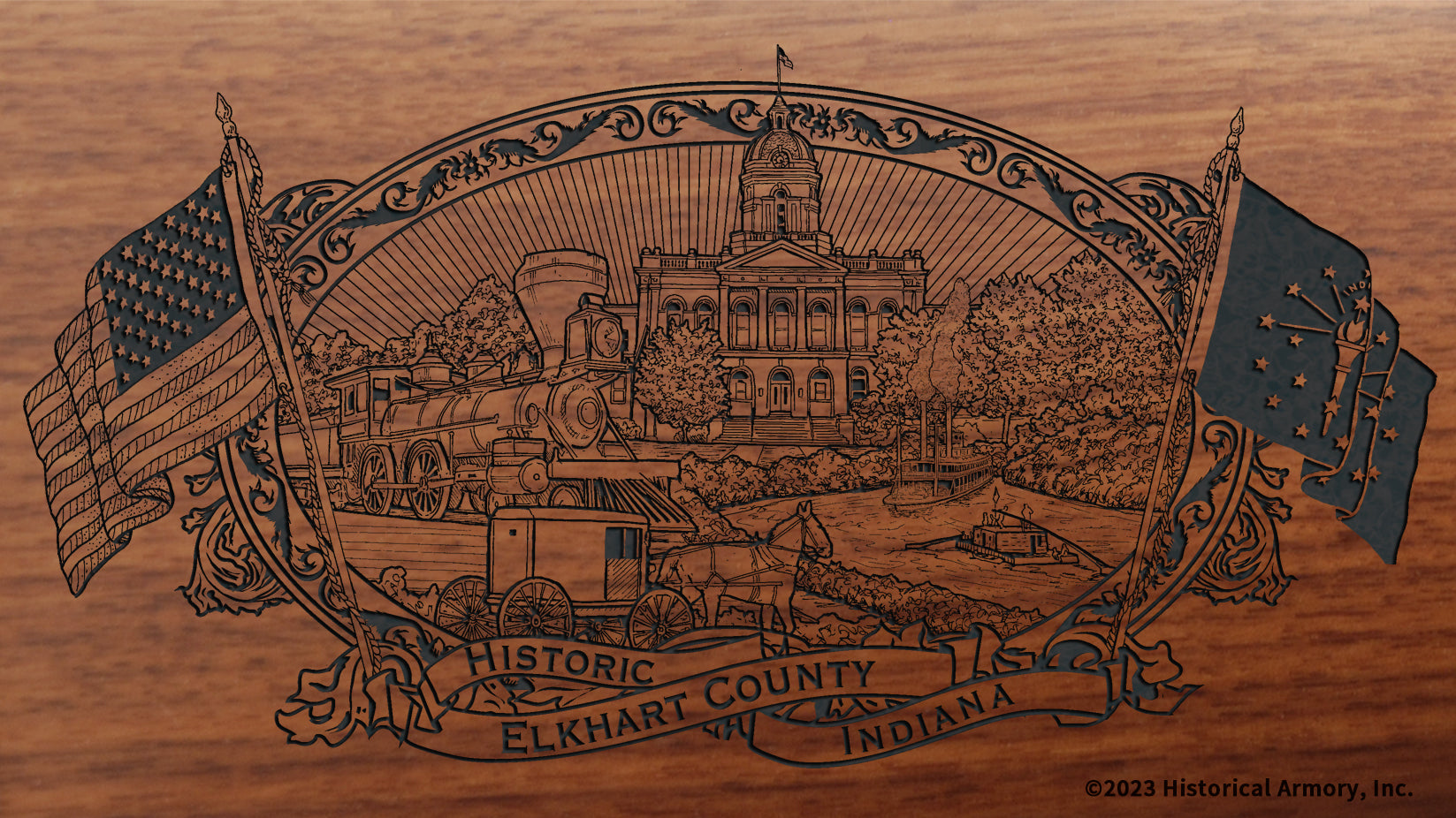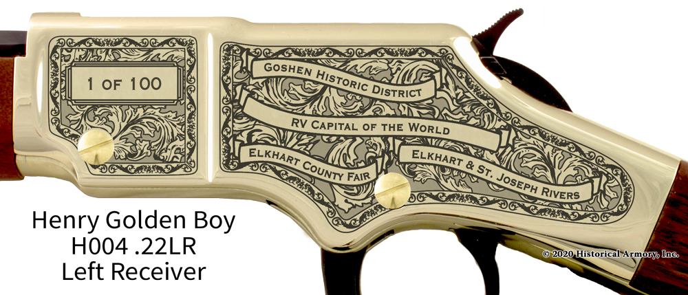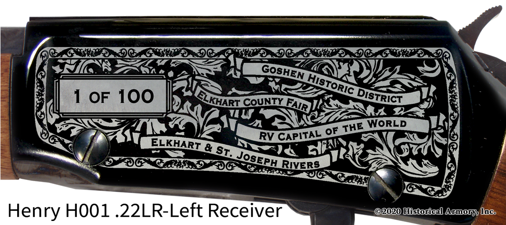 In honor of your county's rich historical legacy, Historical Armory is proud to present the Elkhart County Indiana Limited Historical Edition Rifle. Produced on the affordable, American-made Henry .22 LR rifle (Model H001 & H004) and .30-30 (Model H009BG), the Elkhart County Indiana Limited Historical Edition rifle combines meticulous research, original artwork, and finely detailed engraving to celebrate the history of Elkhart County. There will only be 100 Elkhart County Indiana rifle sets ever produced by Historical Armory. Purchase each model separately or all available rifle models together for a complete limited edition set.