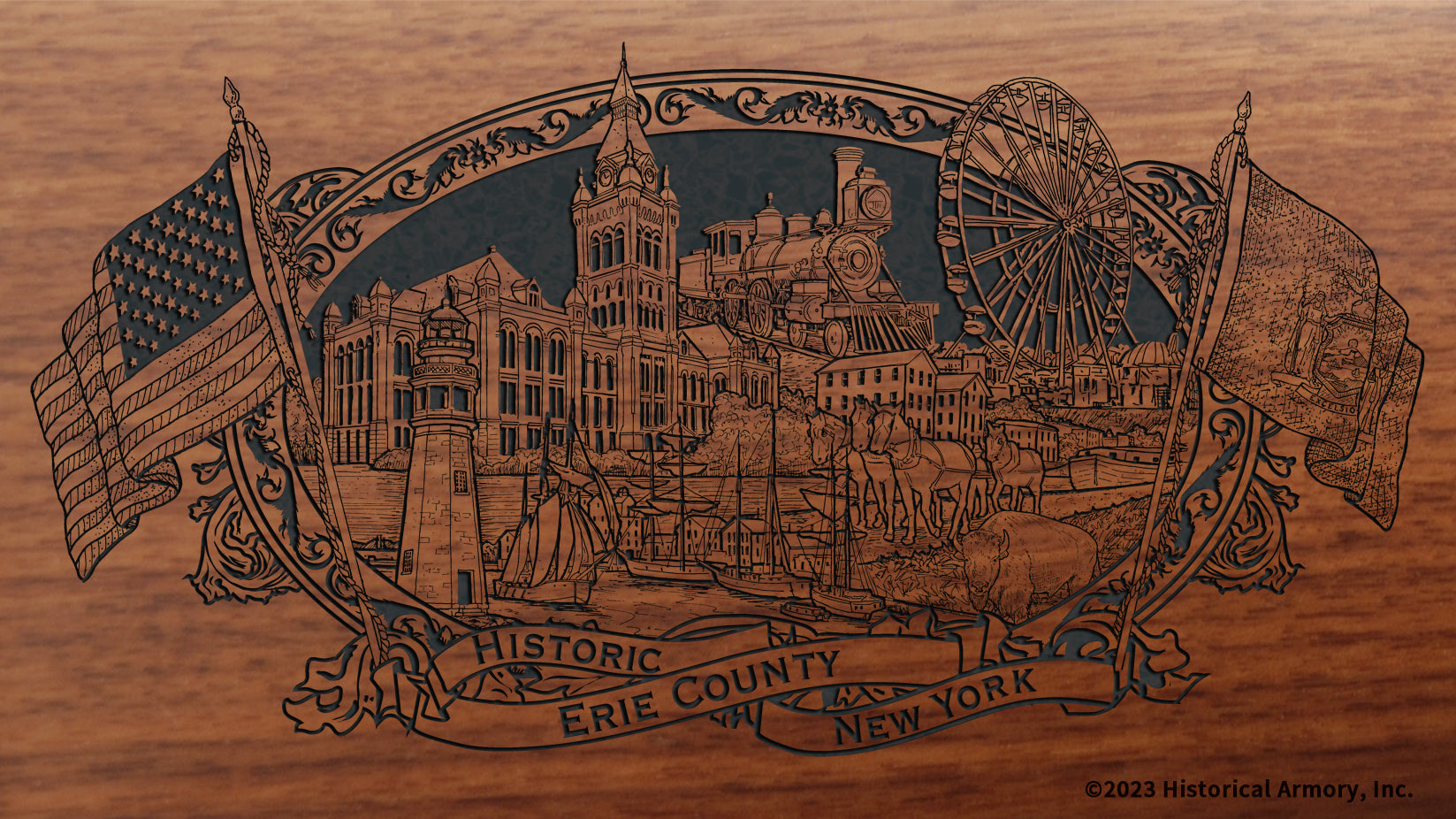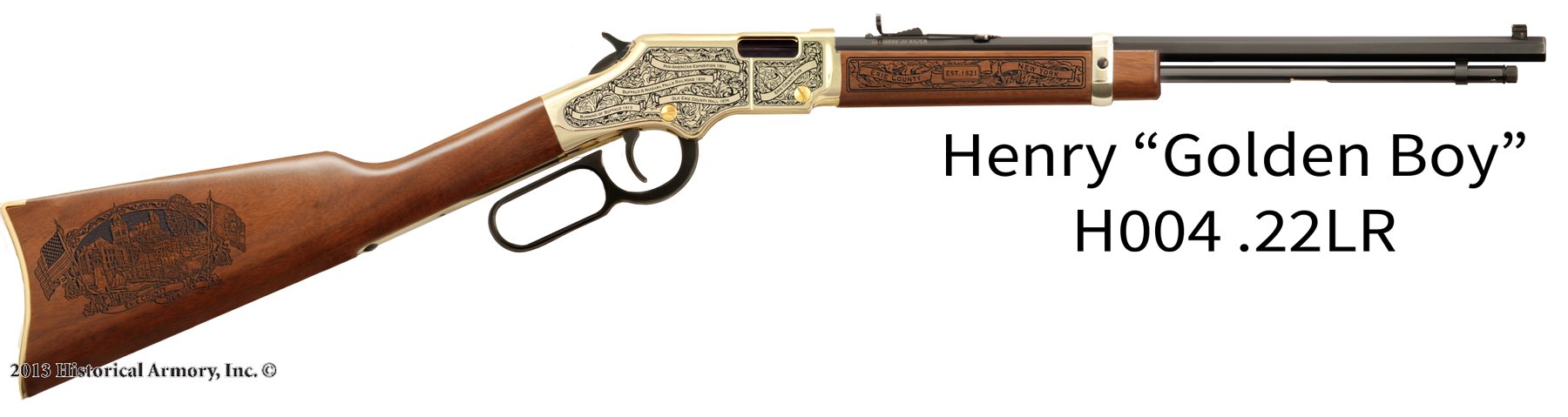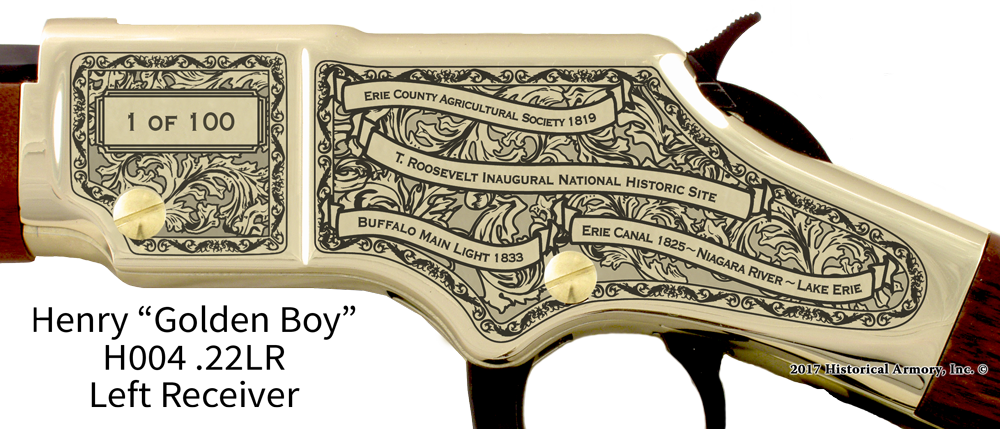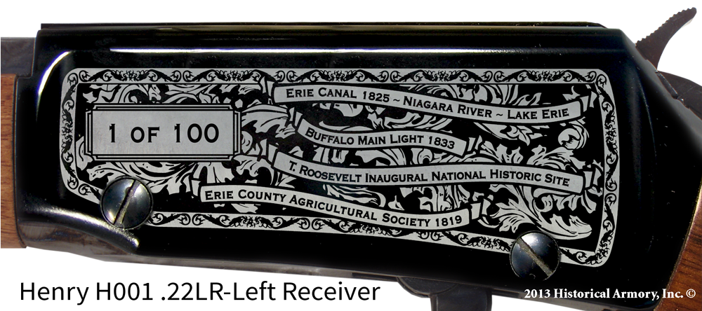 In honor of your county's rich historical legacy, Historical Armory is proud to present the Erie County New York Limited Historical Edition Rifle. Produced on the affordable, American-made Henry .22 LR rifle (Model H001 & H004) and .30-30 (Model H009B), the Erie County New York Limited Historical Edition rifle combines meticulous research, original artwork, and finely detailed engraving to celebrate the history of Erie County. There will only be 100 Erie County New York rifle sets ever produced by Historical Armory. Purchase each model separately or all available rifle models together for a complete limited edition set.