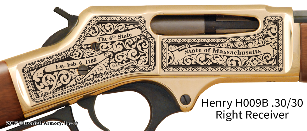 Renowned for their durability and solid construction, Henry rifles offer you a welcome shelter from the planned mechanical obsolescence so common in modern products these days. Well-maintained, they will continue to perform as designed for generations to come, perhaps even one day becoming a treasured family heirloom for your descendants. Start your own tradition of lasting permanence today with the Essex County Massachusetts Engraved Rifle, available only from Historical Armory!