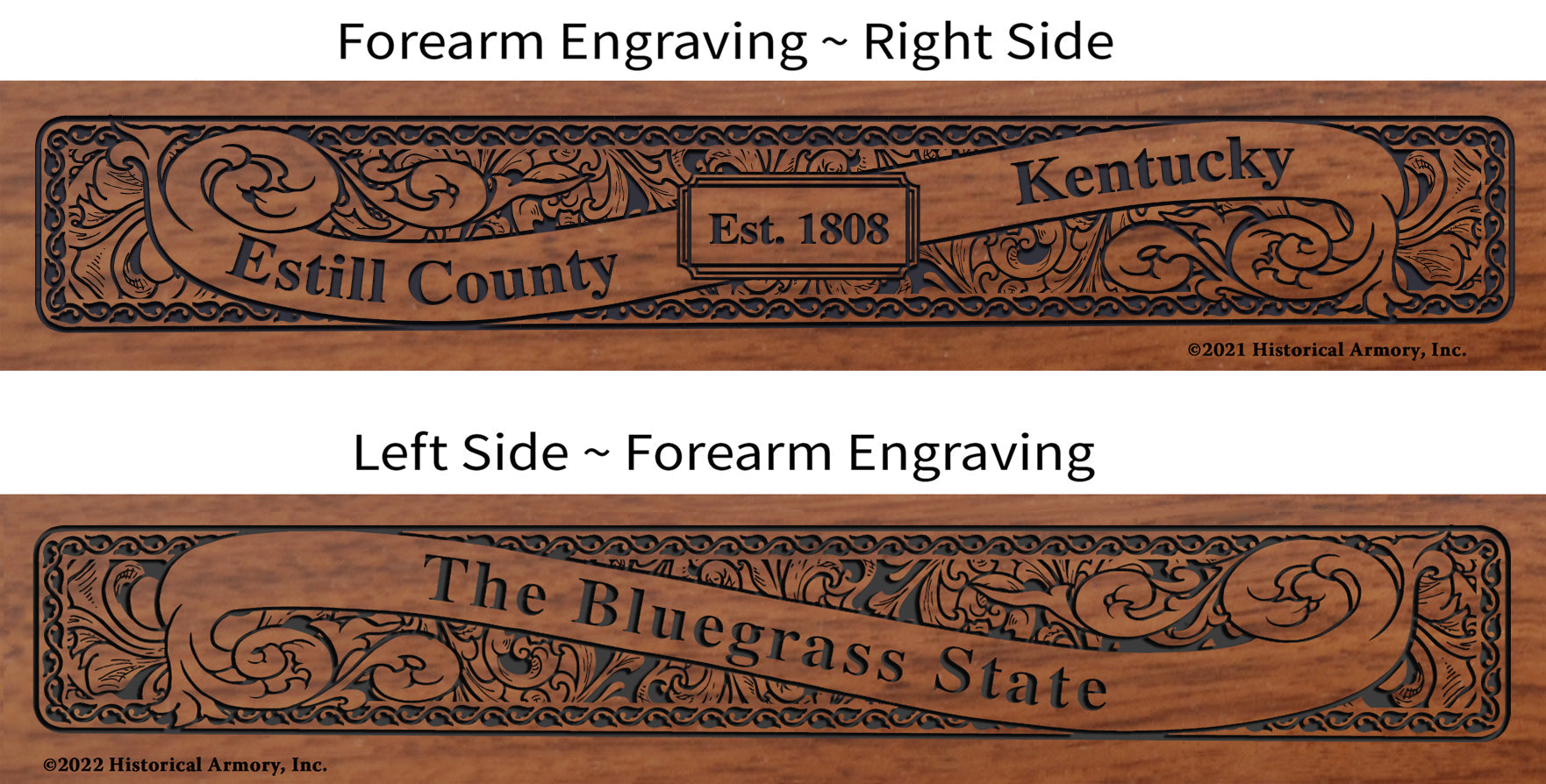 - The right side of the American walnut buttstock is engraved with an intricate, original piece of artwork that captures the unique history of your county, while the left side is reserved for one of a kind personalization.
