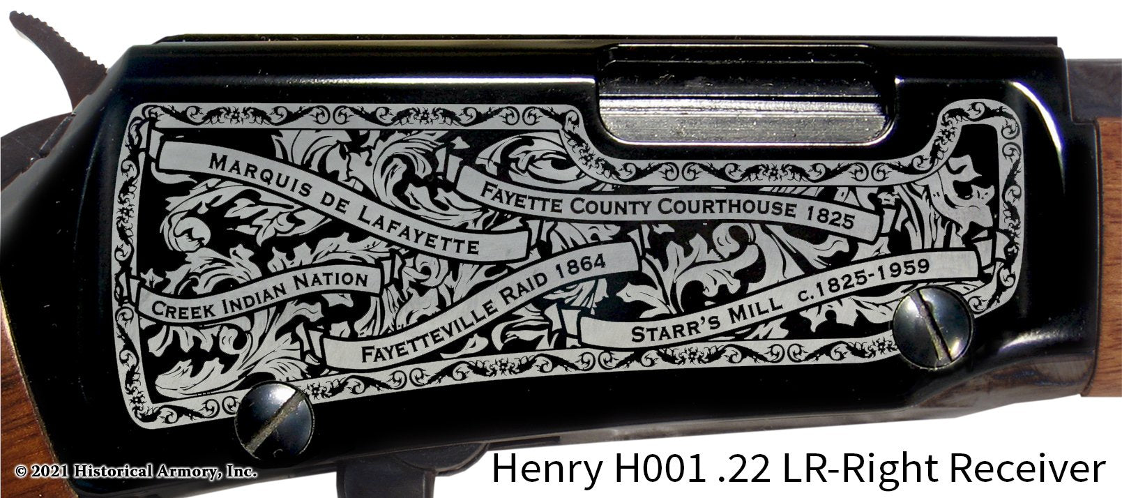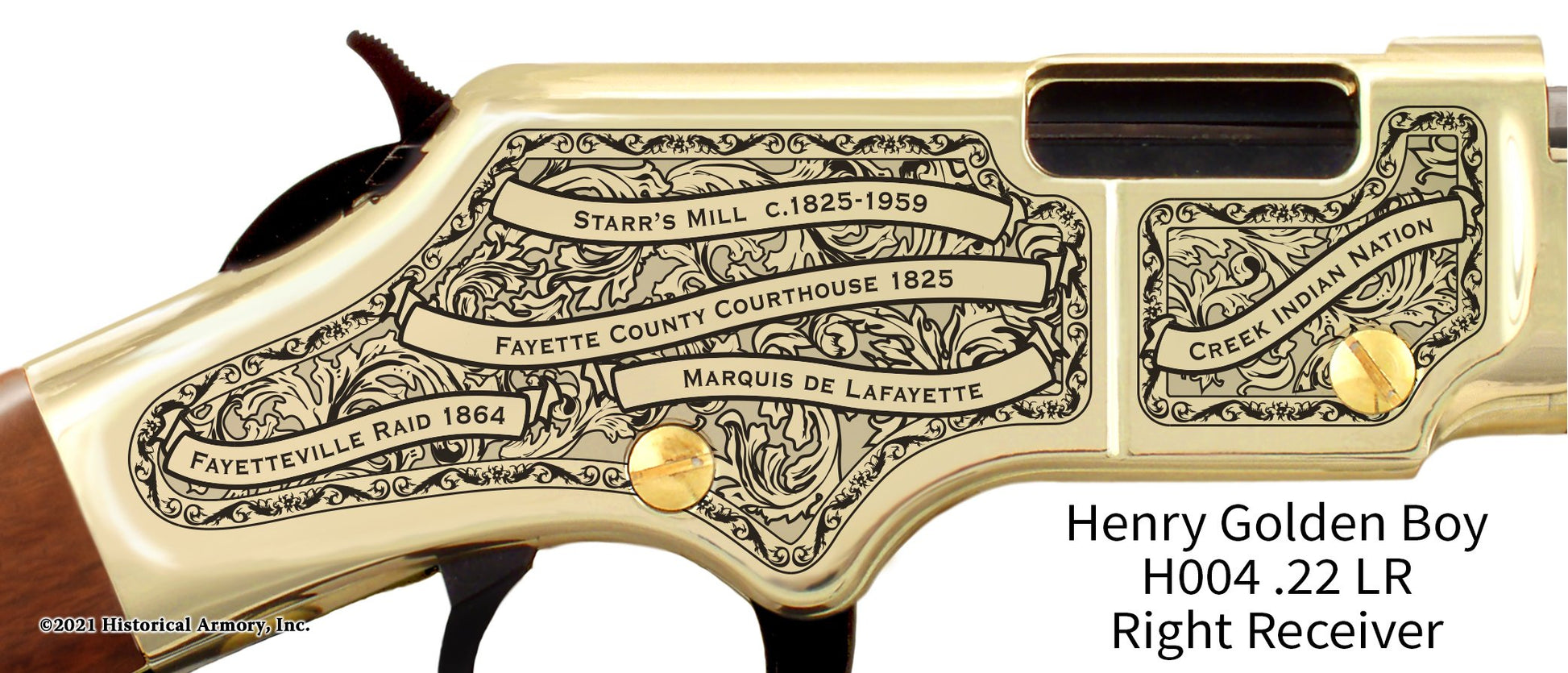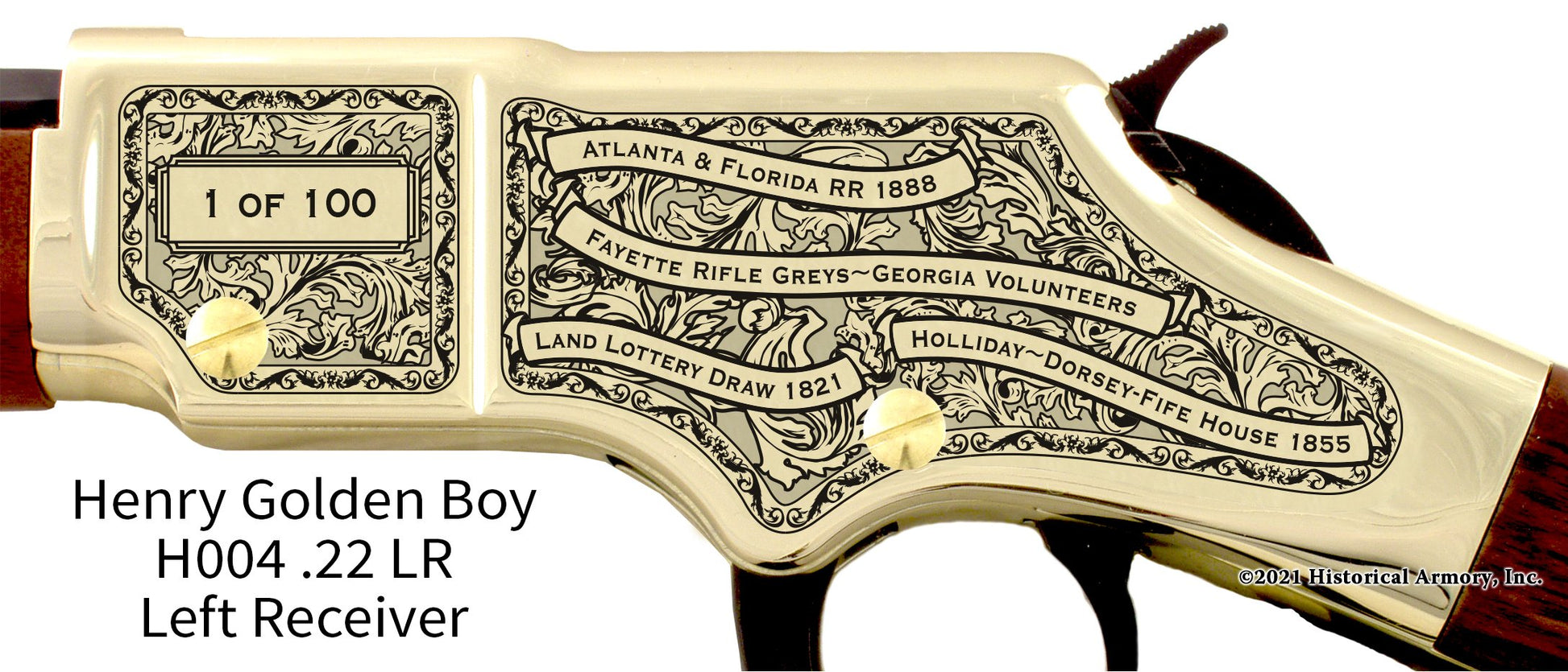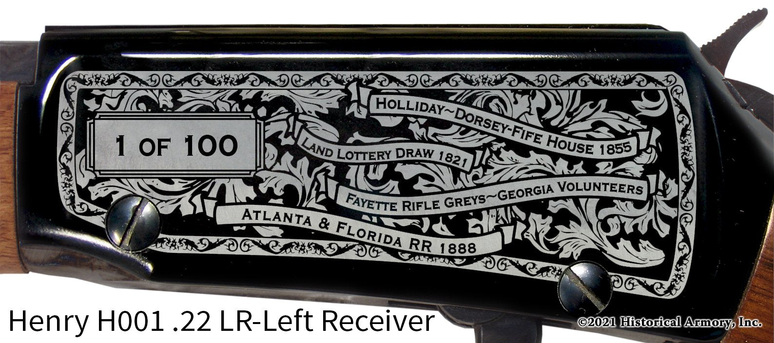 In honor of your county's rich historical legacy, Historical Armory is proud to present the Fayette County Georgia Limited Historical Edition Rifle! Produced on the affordable, American-made Henry .22 LR rifle (Model H001 & H004) and .30-30 (Model H009BG), the Fayette County Georgia Limited Historical Edition rifle combines meticulous research, original artwork, and finely detailed engraving to celebrate the history of Fayette County. There will only be 100 Fayette County Georgia rifles sets ever produced by Historical Armory. Purchase each model separately or all available rifle models together for a complete limited edition set.