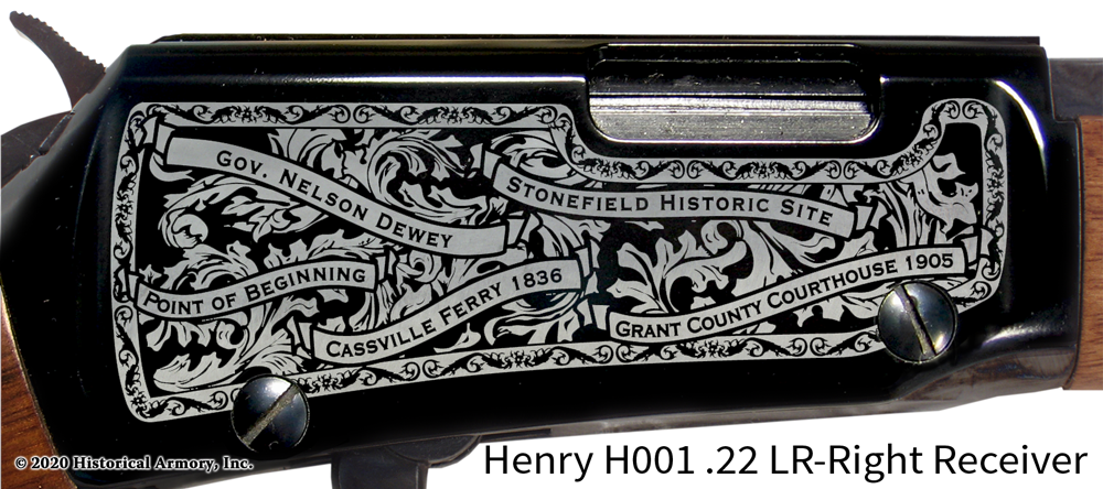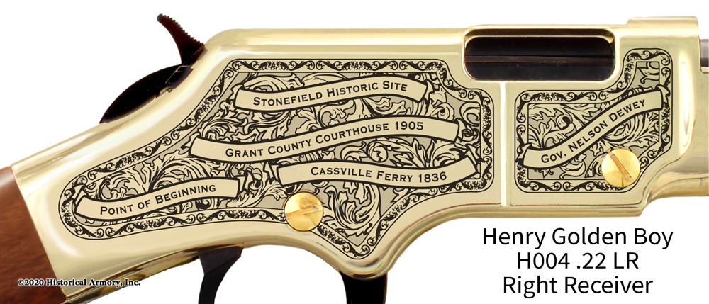 Renowned for their durability and solid construction, Henry rifles offer you a welcome shelter from the planned mechanical obsolescence so common in modern products these days. Well-maintained, they will continue to perform as designed for generations to come, perhaps even one day becoming a treasured family heirloom for your descendants. Start your own tradition of lasting permanence today with the Grant County Wisconsin Engraved Rifle, available only from Historical Armory!