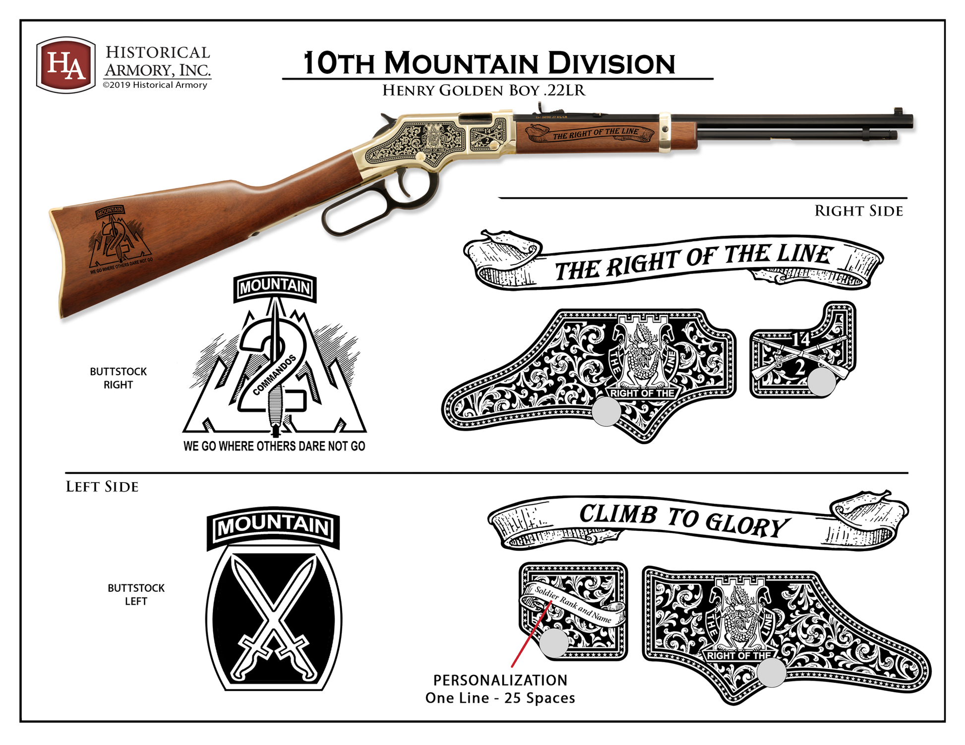 In honor of you who protect our nation and serve with pride, Historical Armory, Inc. is extremely proud to present the 10th Mtn Div Edition. This edition is available on the Henry Golden Boy H004 (.22LR); Big Boy H006, H006C, H006M (.44Mag, .45Colt, .357/.38); H009B ( brass .30-30); H010B ( brass .45-70); and Ruger SR1911 6700 (.45 Auto, SS).