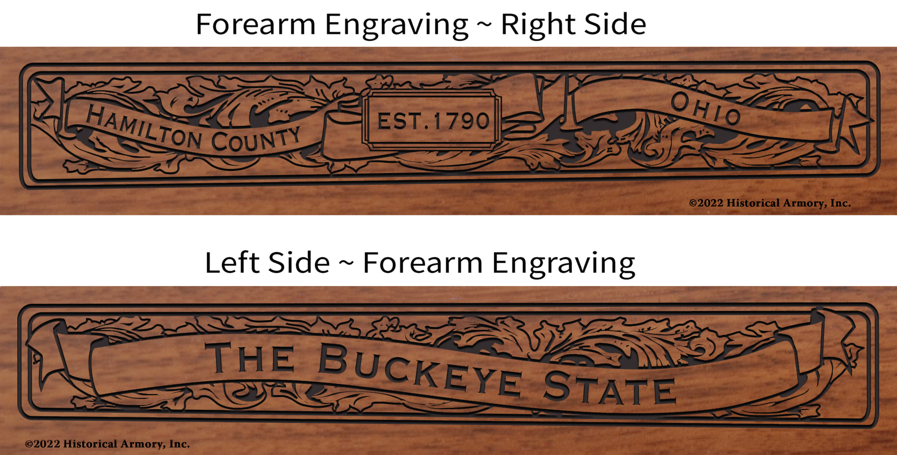 - Detailed engraving on both sides of the American walnut forearm, with the name and establishment date of your county on the right side and your state name and nickname on the left side.