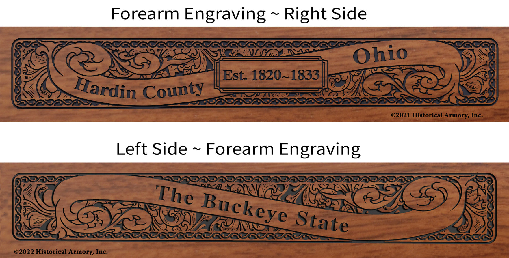 - Detailed engraving on both sides of the American walnut forearm, with the name and establishment date of your county on the right side and your state name and nickname on the left side.