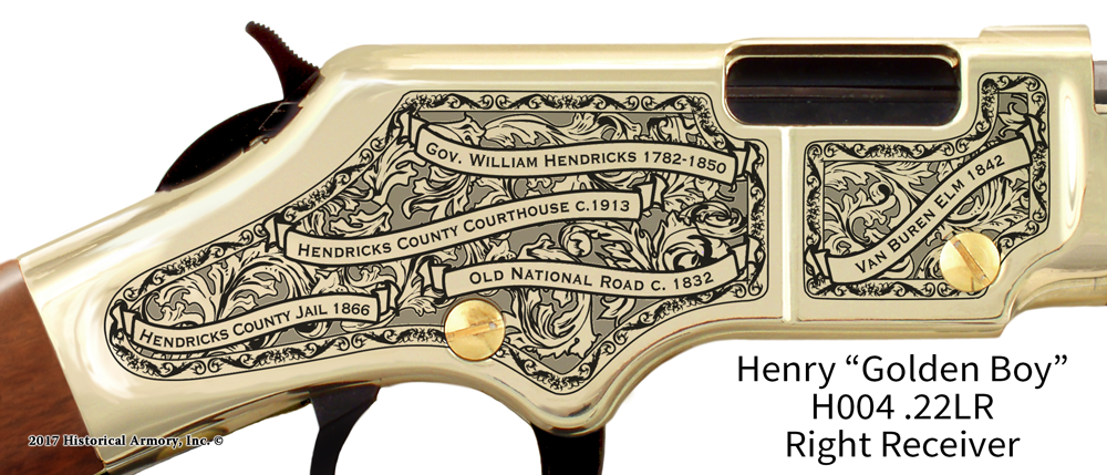 Renowned for their durability and solid construction, Henry rifles offer you a welcome shelter from the planned mechanical obsolescence so common in modern products these days. Well-maintained, they will continue to perform as designed for generations to come, perhaps even one day becoming a treasured family heirloom for your descendants. Start your own tradition of lasting permanence today with the Hendricks County Indiana Engraved Rifle, available only from Historical Armory!