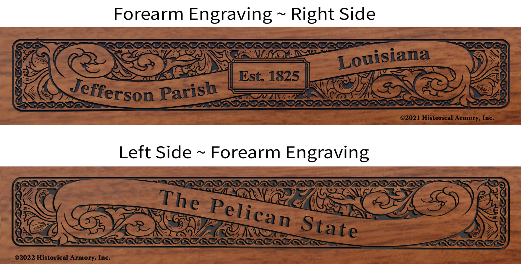 - Detailed engraving on both sides of the American walnut forearm, with the name and establishment date of your parish on the right side and your state name and nickname on the left side.
