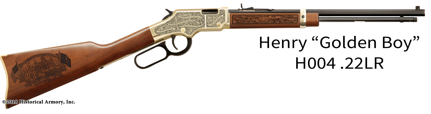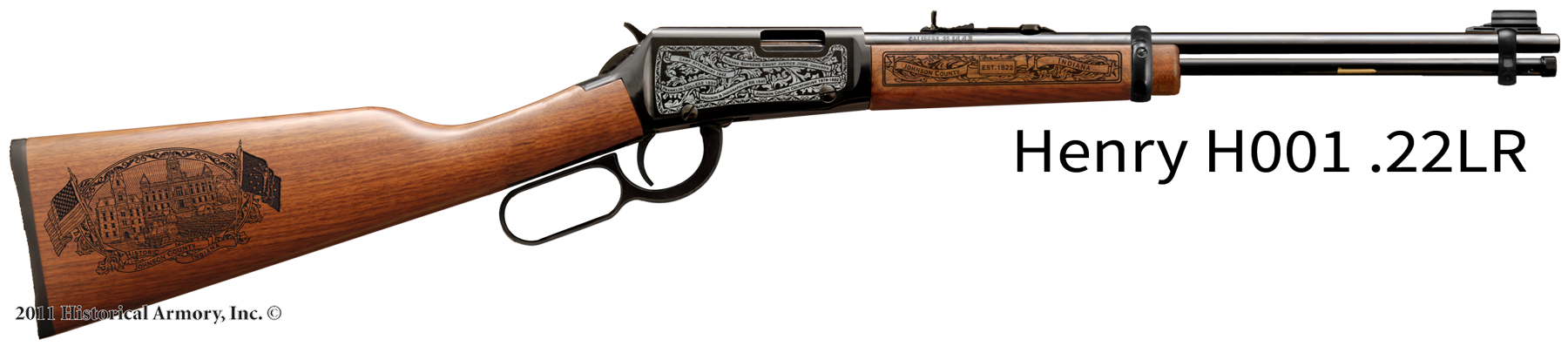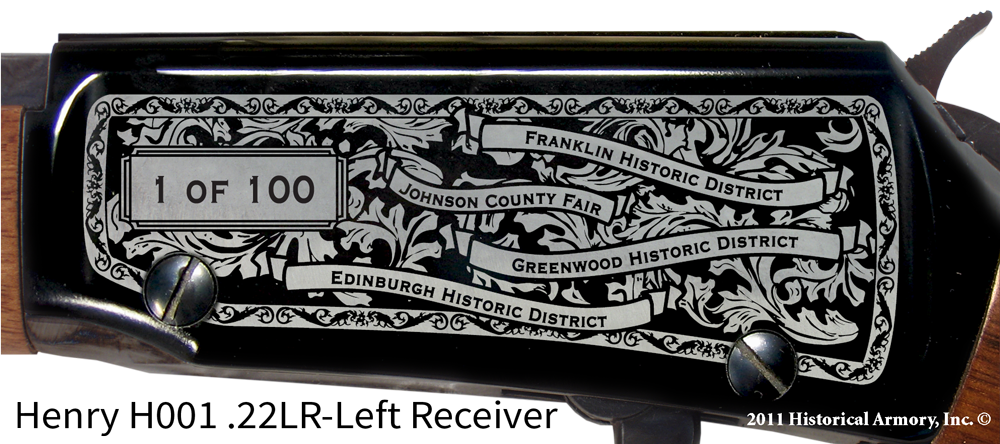 In honor of your county's rich historical legacy, Historical Armory is proud to present the Johnson County Indiana Limited Historical Edition Rifle. Produced on the affordable, American-made Henry .22 LR rifle (Model H001 & H004) and .30-30 (Model H009BG), the Johnson County Indiana Limited Historical Edition rifle combines meticulous research, original artwork, and finely detailed engraving to celebrate the history of Johnson County. There will only be 100 Johnson County Indiana rifle sets ever produced by Historical Armory. Purchase each model separately or all available rifle models together for a complete limited edition set.