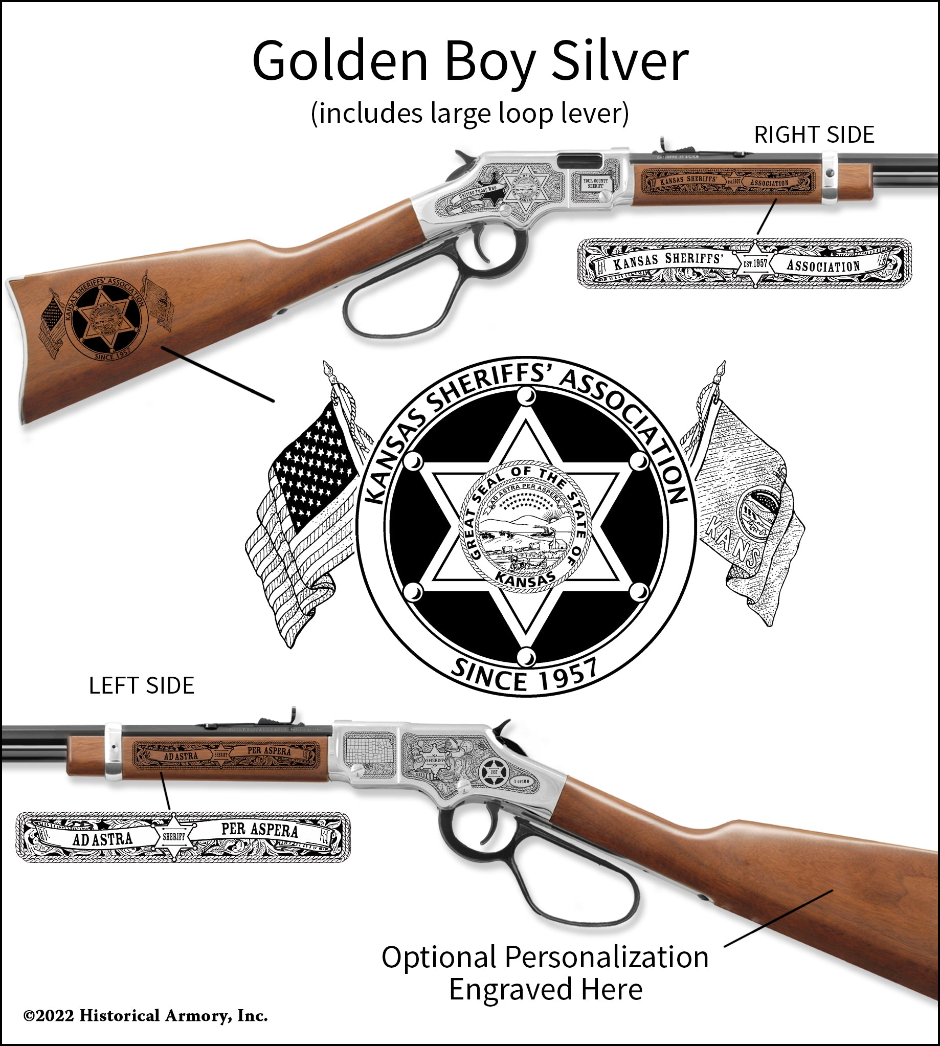 In honor of Kansas legendary lawmen, Historical Armory is proud to present the Kansas Sheriffs' Association Edition. This is a numbered edition, limited to 100 buyers and is available on the Henry Golden Boy H004L (.22LR w/ large loop); Henry Golden Boy Silver H004SL (.22LR w/ large loop); Big Boy brass side gate H006GL, H006GCL, H006GMLL (.44Mag, .45Colt, .357/.38 -with a large loop), Ruger 1911 6700 (.45 Auto), and Ruger Vaquero 5104 (.45Colt). Purchase all in the same edition number for a complete set!