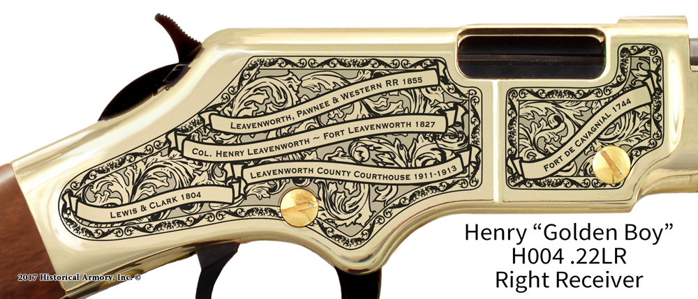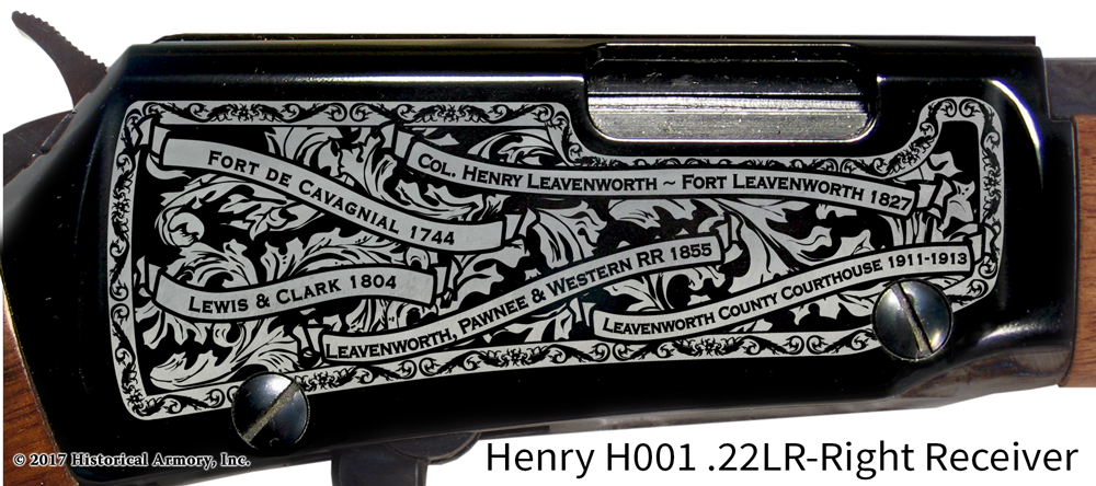 Renowned for their durability and solid construction, Henry rifles offer you a welcome shelter from the planned mechanical obsolescence so common in modern products these days. Well-maintained, they will continue to perform as designed for generations to come, perhaps even one day becoming a treasured family heirloom for your descendants. Start your own tradition of lasting permanence today with the Leavenworth County Kansas Engraved Rifle, available only from Historical Armory!