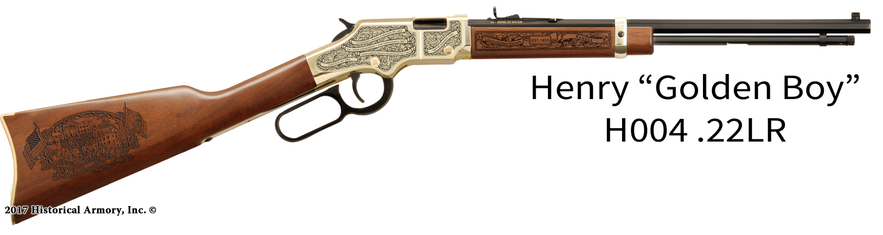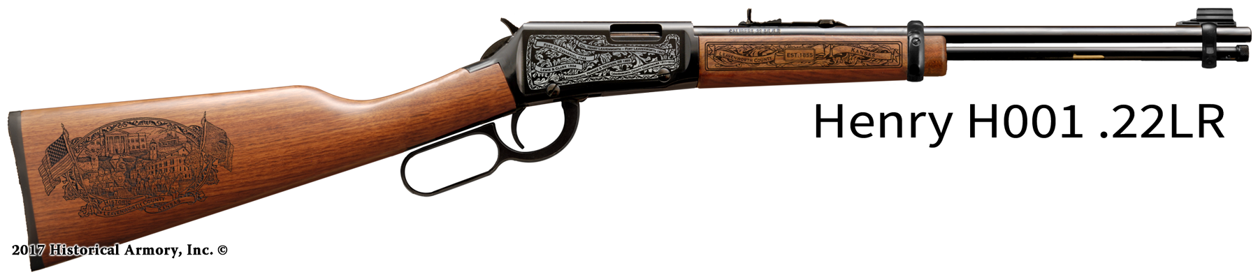 In honor of your county's rich historical legacy, Historical Armory is proud to present the Leavenworth County Kansas Limited Historical Edition Rifle. Produced on the affordable, American-made Henry .22 LR rifle (Model H001 & H004) and .30-30 (Model H009BG), the Leavenworth County Kansas Limited Historical Edition rifle combines meticulous research, original artwork, and finely detailed engraving to celebrate the history of Leavenworth County. There will only be 50 Leavenworth County Kansas rifle sets ever produced by Historical Armory. Purchase each model separately or all available rifle models together for a complete limited edition set.