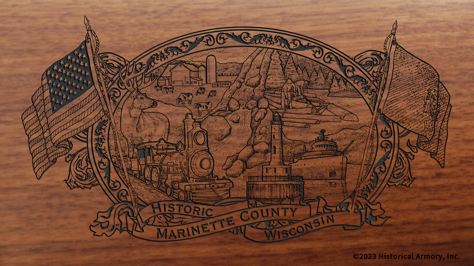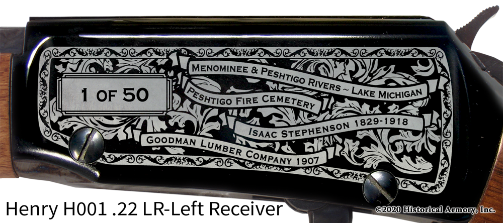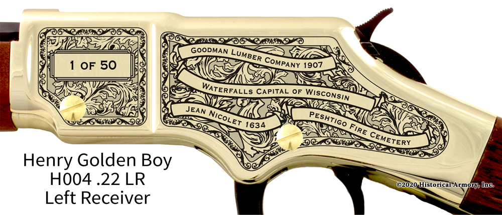 In honor of your county's rich historical legacy, Historical Armory is proud to present the Marinette County Wisconsin Limited Historical Edition Rifle. Produced on the affordable, American-made Henry .22 LR rifle (Model H001 & H004) and .30-30 (Model H009BG), the Marinette County Wisconsin Limited Historical Edition rifle combines meticulous research, original artwork, and finely detailed engraving to celebrate the history of Marinette County. There will only be 50 Marinette County Wisconsin rifle sets ever produced by Historical Armory. Purchase each model separately or all available rifle models together for a complete limited edition set.