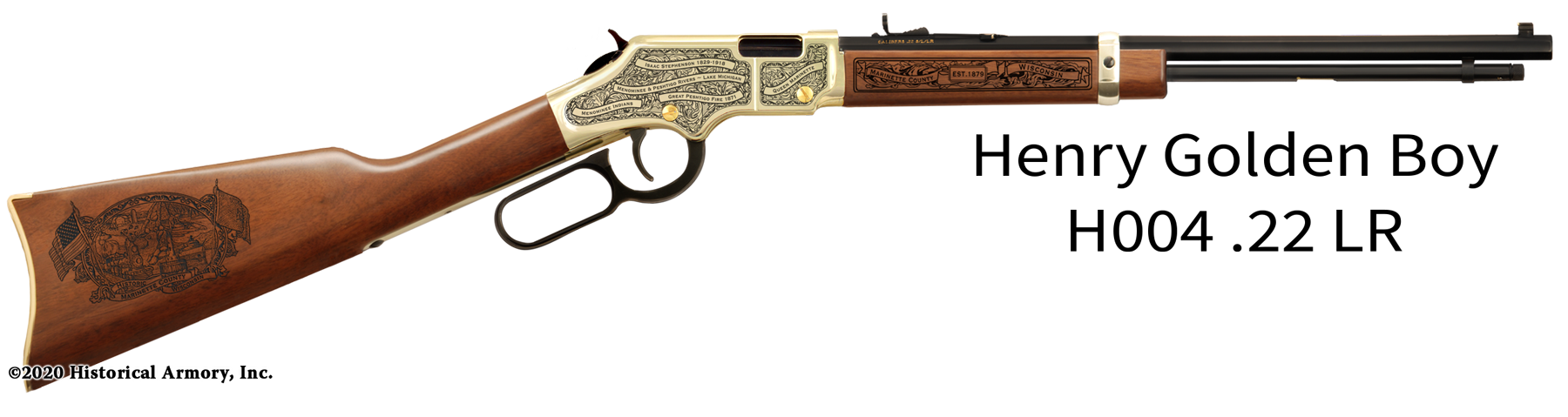 Renowned for their durability and solid construction, Henry rifles offer you a welcome shelter from the planned mechanical obsolescence so common in modern products these days. Well-maintained, they will continue to perform as designed for generations to come, perhaps even one day becoming a treasured family heirloom for your descendants. Start your own tradition of lasting permanence today with the Marinette County Wisconsin Engraved Rifle, available only from Historical Armory!