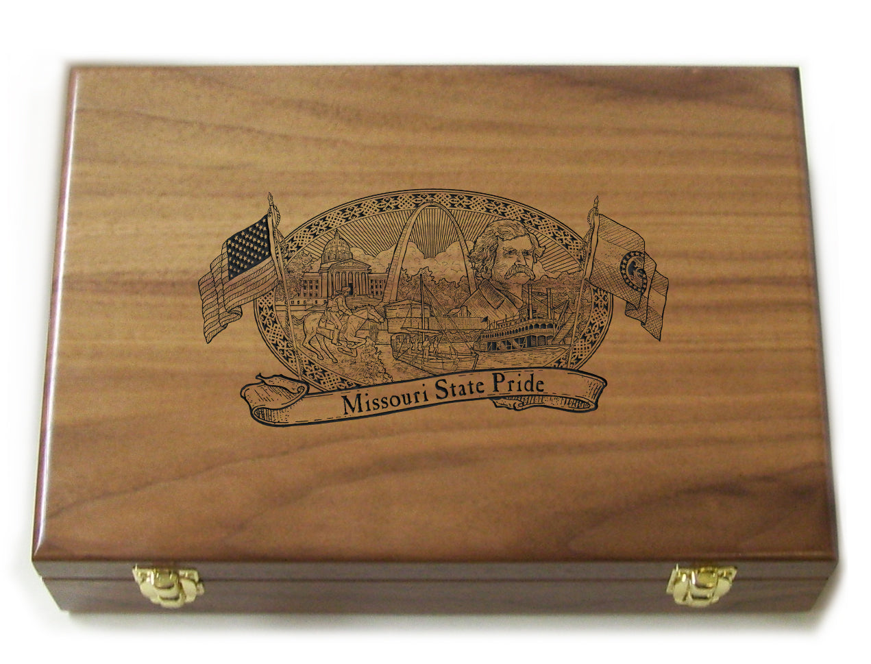 A genuine hardwood presentation case. The case is engraved with an intricate piece of artwork that captures the unique history of your state.
