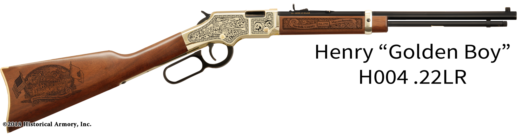 In honor of your county's rich historical legacy, Historical Armory is proud to present the Norfolk County Massachusetts Limited Historical Edition Rifle. Produced on the affordable, American-made Henry .22 LR rifle (Model H001 & H004) and .30-30 (Model H009BG), the Norfolk County Massachusetts Limited Historical Edition rifle combines meticulous research, original artwork, and finely detailed engraving to celebrate the history of Norfolk County. There will only be 50 Norfolk County Massachusetts rifle sets ever produced by Historical Armory. Purchase each model separately or all available rifle models together for a complete limited edition set.