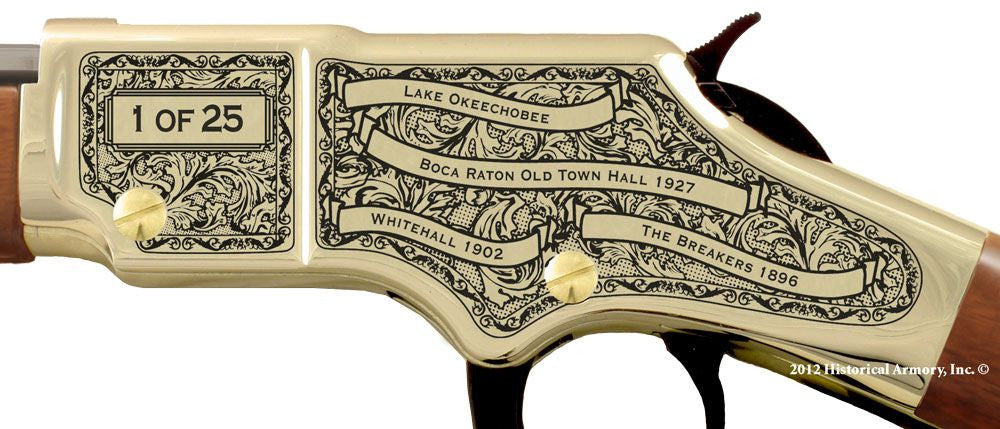 Renowned for their durability and solid construction, Henry rifles offer you a welcome shelter from the planned mechanical obsolescence so common in modern products these days. Well-maintained, they will continue to perform as designed for generations to come, perhaps even one day becoming a treasured family heirloom for your descendants. Start your own tradition of lasting permanence today with the Palm Beach County Florida Engraved Rifle, available only from Historical Armory!