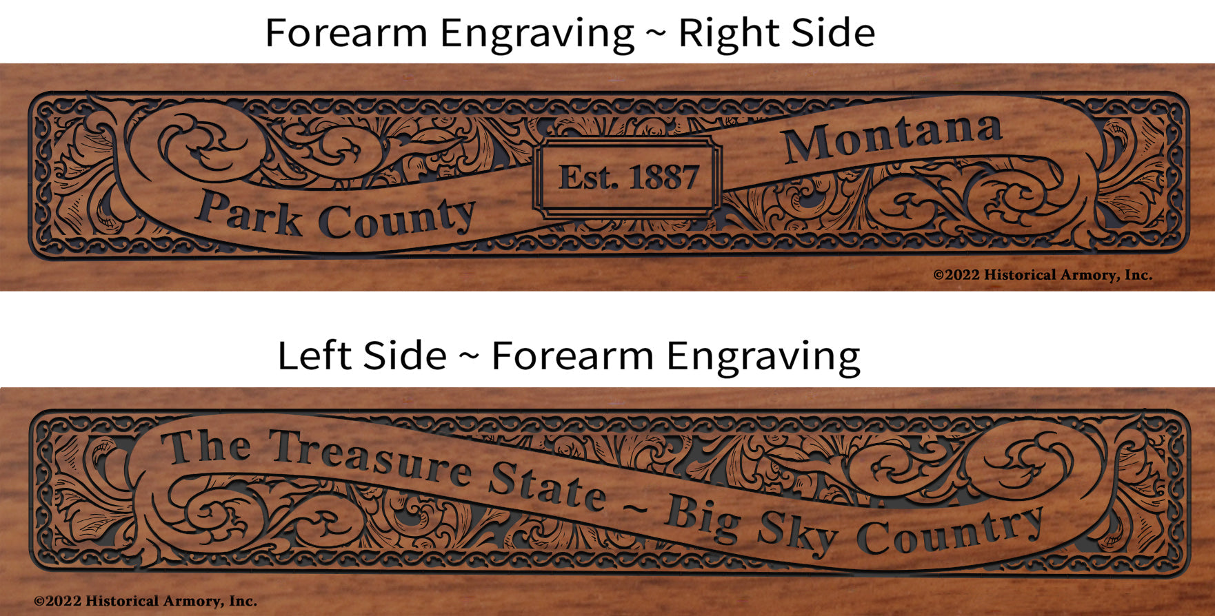 - Detailed engraving on both sides of the American walnut forearm, with the name and establishment date of your county on the right side and your state name and nickname on the left side.