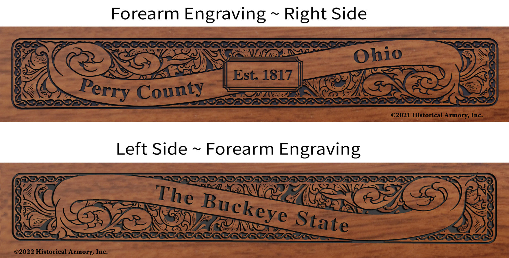 - Detailed engraving on both sides of the American walnut forearm, with the name and establishment date of your county on the right side and your state name and nickname on the left side.