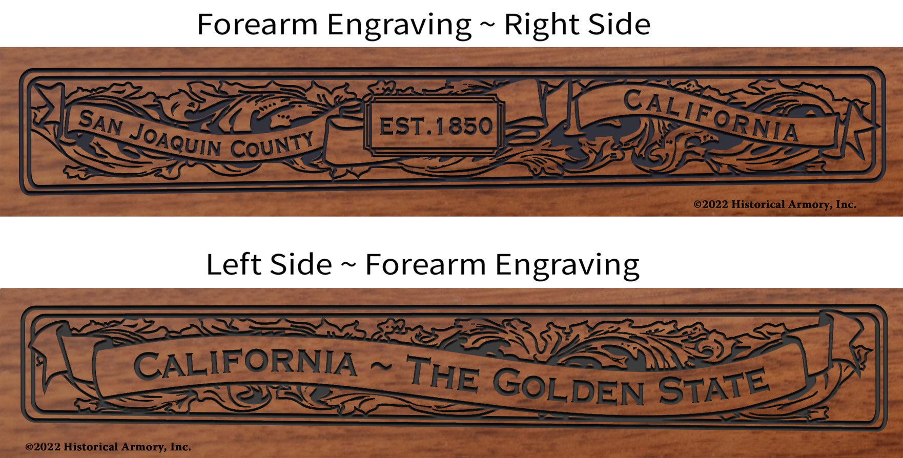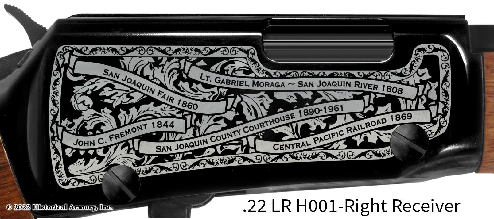 Renowned for their durability and solid construction, Henry rifles offer you a welcome shelter from the planned mechanical obsolescence so common in modern products these days. Well-maintained, they will continue to perform as designed for generations to come, perhaps even one day becoming a treasured family heirloom for your descendants. Start your own tradition of lasting permanence today with the San Joaquin County California Engraved Rifle, available only from Historical Armory!