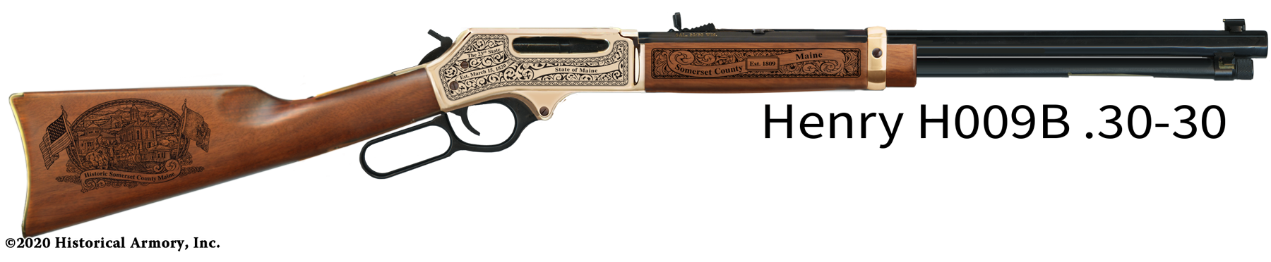 In honor of your county's rich historical legacy, Historical Armory is proud to present the Somerset County Maine Limited Historical Edition Rifle. Produced on the affordable, American-made Henry .22 LR rifle (Model H001 & H004) and .30-30 (Model H009BG), the Somerset County Maine Limited Historical Edition rifle combines meticulous research, original artwork, and finely detailed engraving to celebrate the history of Somerset County. There will only be 50 Somerset County Maine rifle sets ever produced by Historical Armory. Purchase each model separately or all available rifle models together for a complete limited edition set.