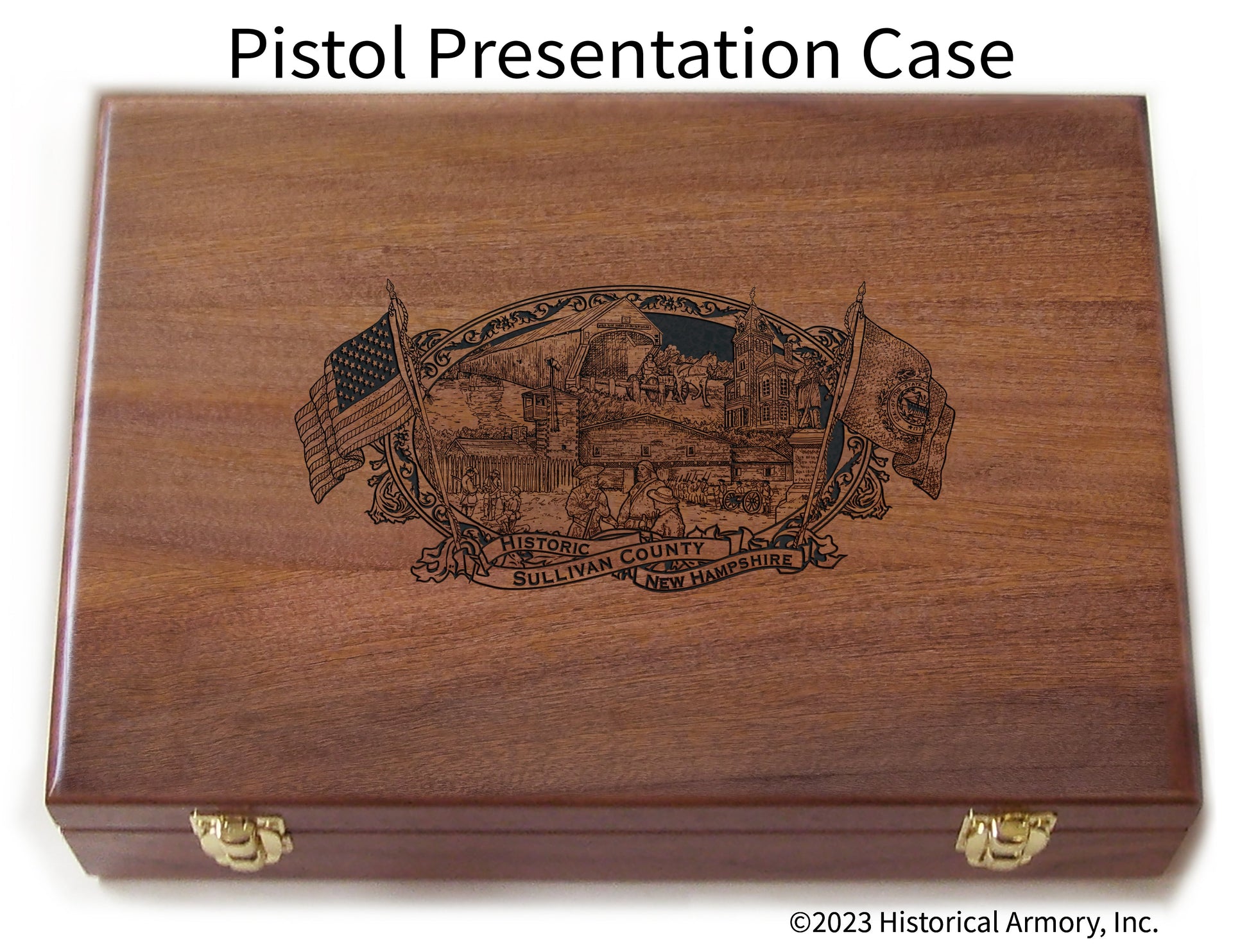 A genuine hardwood presentation case. The case is engraved with an intricate piece of artwork that captures the unique history of your county.