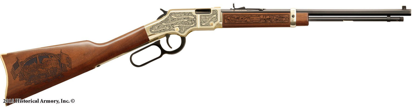 Renowned for their durability and solid construction, Henry rifles offer you a welcome shelter from the planned mechanical obsolescence so common in modern products these days. Well-maintained, they will continue to perform as designed for generations to come, perhaps even one day becoming a treasured family heirloom for your descendants. Start your own tradition of lasting permanence today with the Sussex County New Jersey Engraved Rifle, available only from Historical Armory!