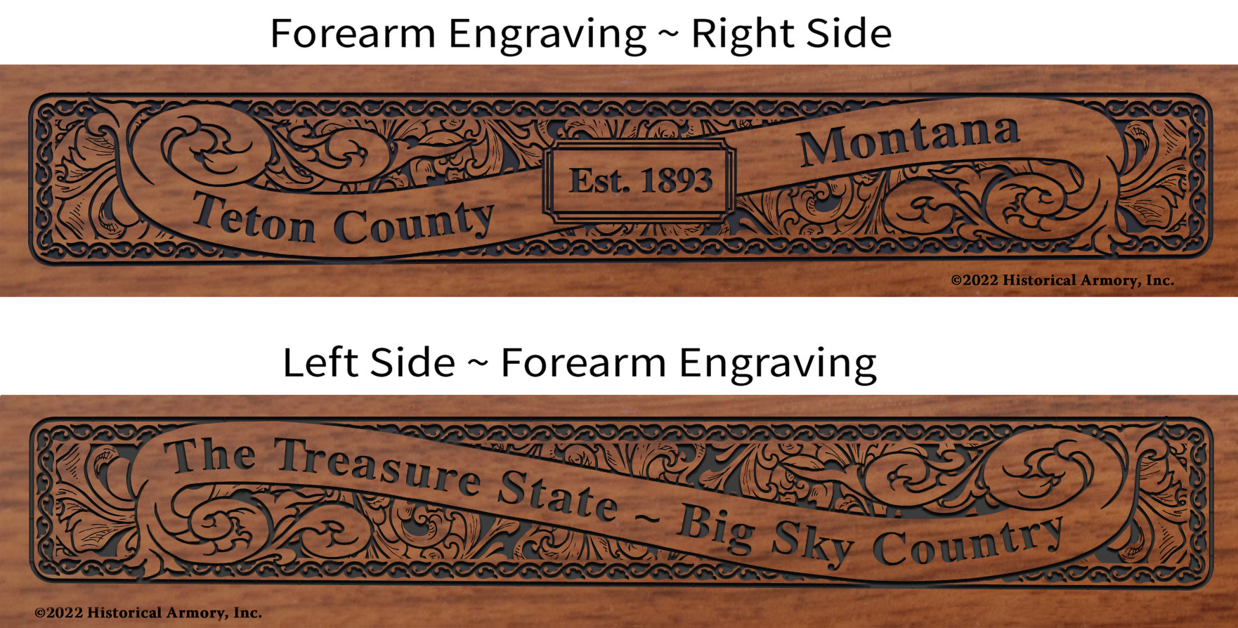- Detailed engraving on both sides of the American walnut forearm, with the name and establishment date of your county on the right side and your state name and nickname on the left side.