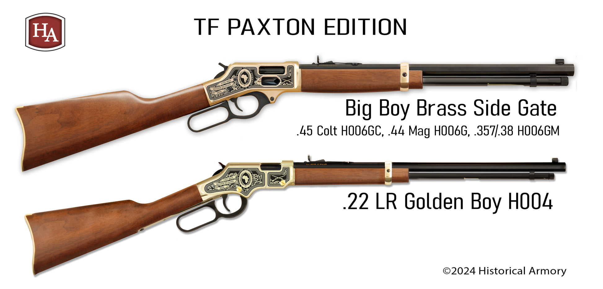 In honor of you who protect our nation and serve with pride, Historical Armory, Inc. is extremely proud to present the TF Paxton Edition. This edition is available on the Henry Golden Boy H004 (.22LR); and Big Boy brass side gate H006G, H006GC, H006GM (.44Mag, .45Colt, .357/.38). ACT NOW, because this group order is closed after July 15, 2024.