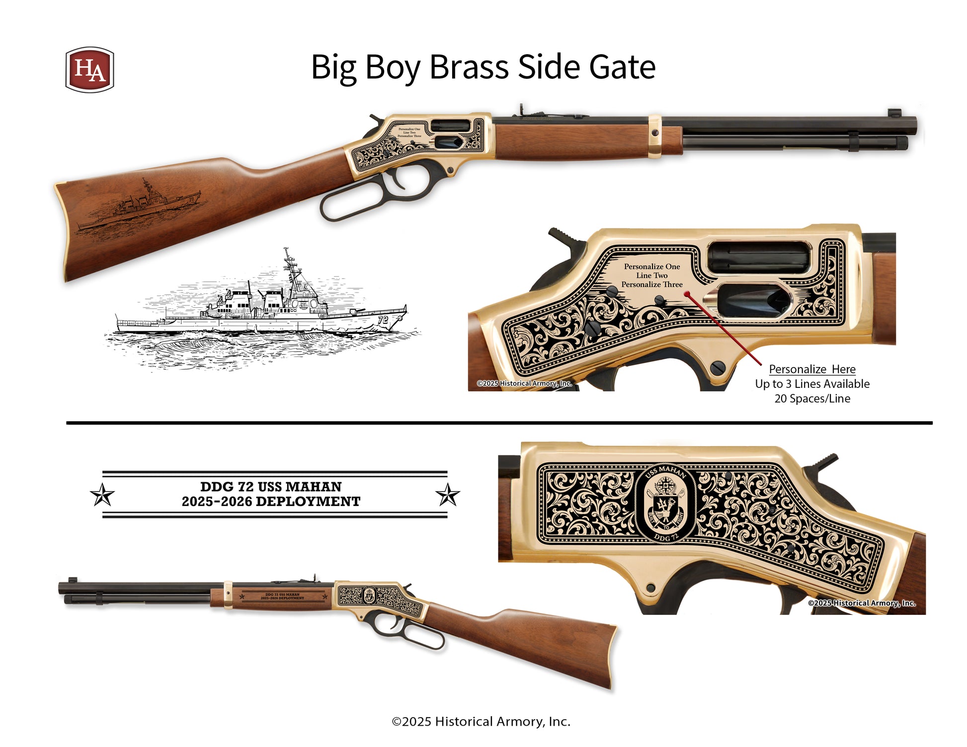 In honor of you who protect our nation and serve with pride, Historical Armory, Inc. is extremely proud to present the USS Mahan DDG 72 Edition. This edition is available on the Henry Big Boy brass side gate H006G, H006GC, H006GM (.44Mag, .45Colt, .357/.38). ACT NOW, because this group order is closed after November 2, 2025.