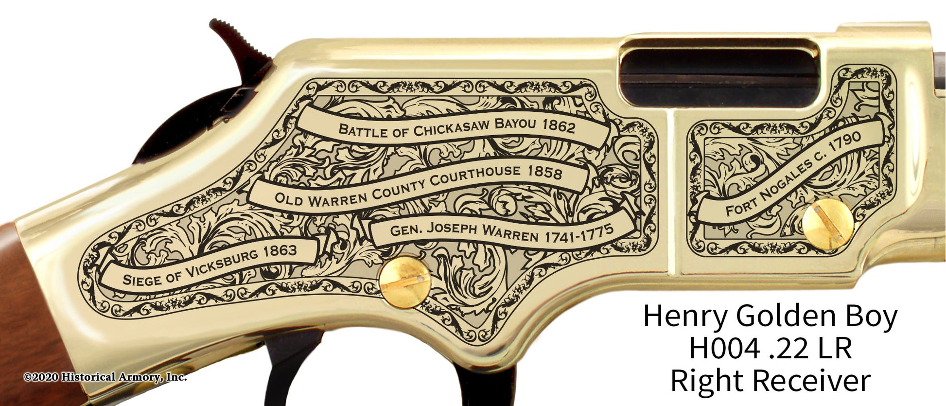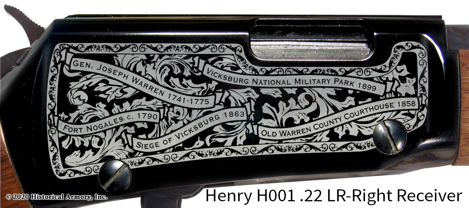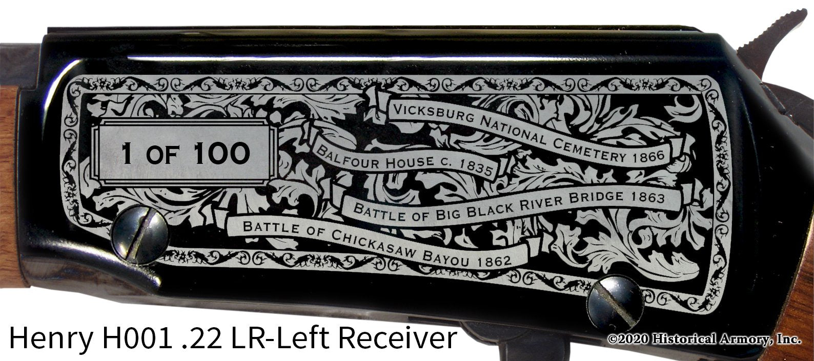 In honor of your county's rich historical legacy, Historical Armory is proud to present the Warren County Mississippi Limited Historical Edition Rifle. Produced on the affordable, American-made Henry .22 LR rifle (Model H001 & H004) and .30-30 (Model H009BG), the Warren County Mississippi Limited Historical Edition rifle combines meticulous research, original artwork, and finely detailed engraving to celebrate the history of Warren County. There will only be 100 Warren County Mississippi rifle sets ever produced by Historical Armory. Purchase each model separately or all available rifle models together for a complete limited edition set.